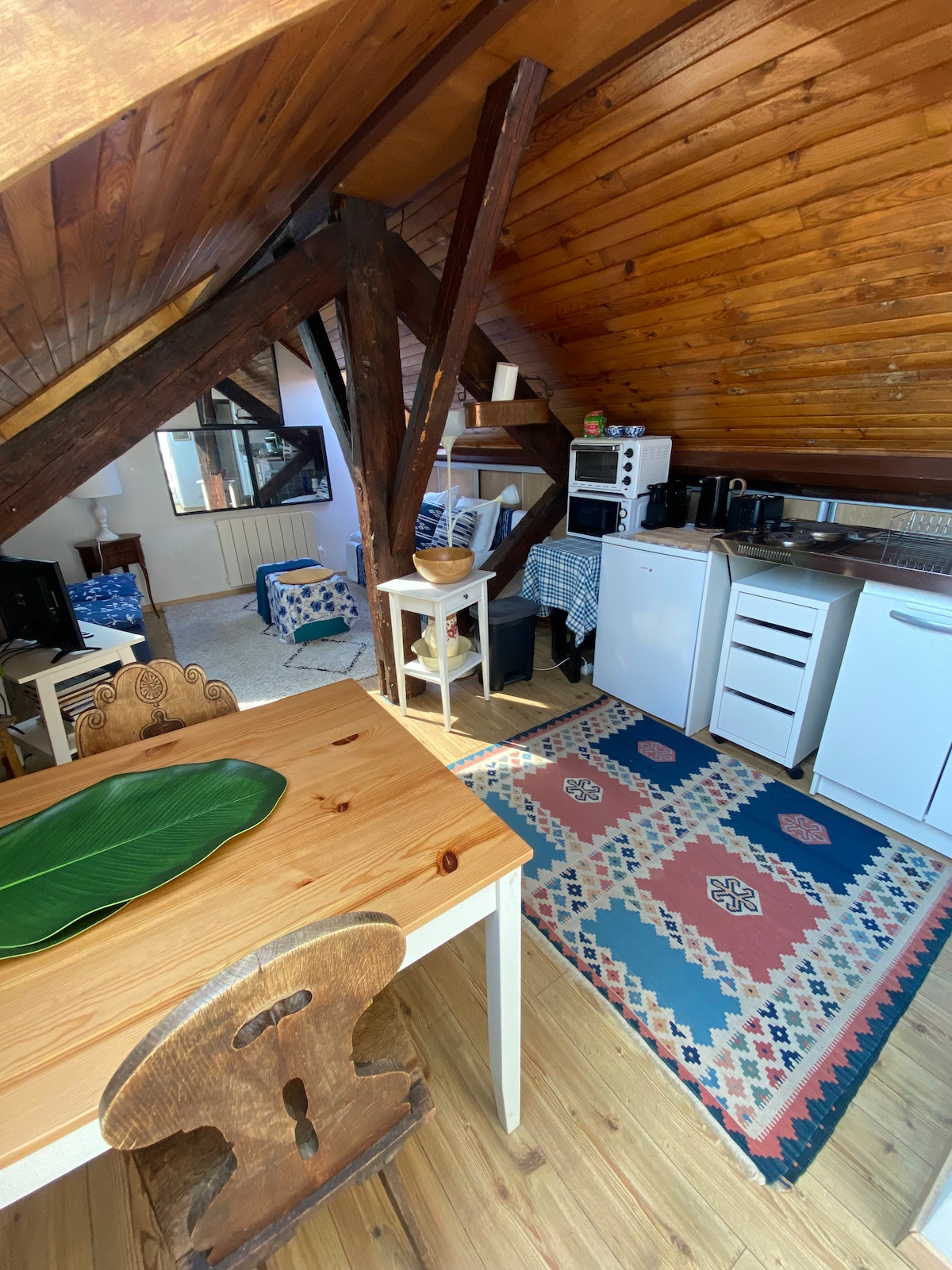 Smještena iznad šume i reke, naša svetla i udobna seoska kućica nalazi se u mirnom području i na kratkoj šetnji od prirode, reke, počevši od pješačkih staza i 3 minuta od šatla(funkcioniše zimi) Potkrovlje idealno za opuštanje i opuštanje pored kamina ili u hidromasažnoj kadi. Savršeno za parove. Za više od 2 osobe na zahtev. Ima jednu spavaću sobu (2 osobe) i 1 otvoreni prostor ispod mezanina sa TV-om i udobnim kaučem na razvlačenje.