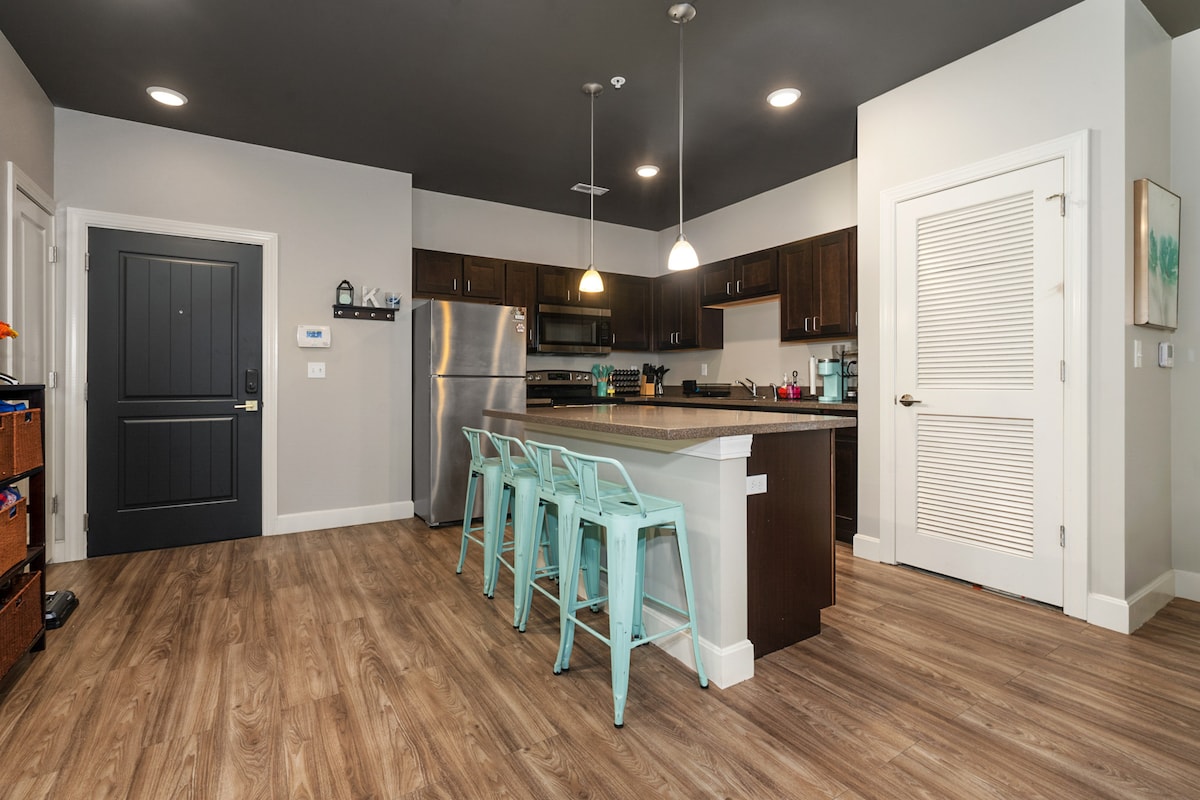 Ovaj dupleks je savršena stanica za umornog putnika! Spavajte u velikom bračnom krevetu ili podesivom bračnom krevetu! Garaža za parkiranje. Ovaj prostor je u potpunosti prilagođen osobama s invaliditetom. Jedan sprat, podovi od tvrdog drveta protiv alergena. Tuš kabina u ravnini poda sa rukohvatima. Podignuta komoda. Za udobnost dnevnog boravka, obezbijedili smo stolicu za masažu, kauč na razvlačenje, Xbox Game sistem i TV sa premium kanalima na Rokuu! Kuhinja je veoma otvorena i potpuno opremljena. 10 minuta od KU i centra grada na 5 minuta do i-70.