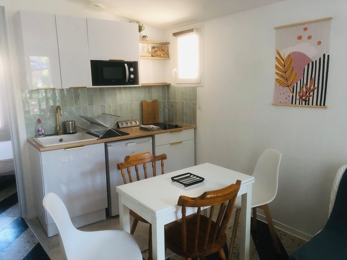 Petite maison (28m2) refaite à neuf, idéalement située à 300m de la plage et 1mn du coeur de village et des commerces. Deux pièces traversant au calme. Profitez du jardin/terrasse pour vos repas et pour vous reposer. La cour vous permet aussi de garer votre voiture en sécurité. L’ensemble du logement est climatisé et possède un accès Internet WIFI fibre très haut débit. Idéal pour les couples, les groupes d'amis ou les familles jusqu'à 2 enfants.