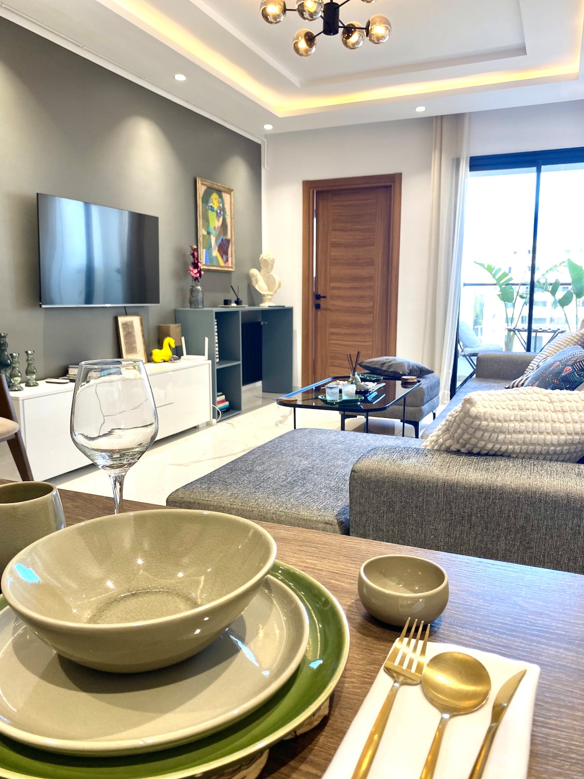 Un intérieur qui célèbre l’authenticité et qui permet d’avoir un espace de vie unique Un appart décoré avec des objets artisanaux qui racontent une histoire, chaque pièce artisanale contribue à l’originalité de notre espace. Appart situé aux Jardins de Carthage à 15mn de l’aéroport 5mn du lac 2 et du centre commercial Carrefour la Marsa, proche de toutes commodités, la Marsa, Carthage, la Goulette Appart dispose d’une place de parking au sous-sol, fibre optique, smart TV, un coin bureau