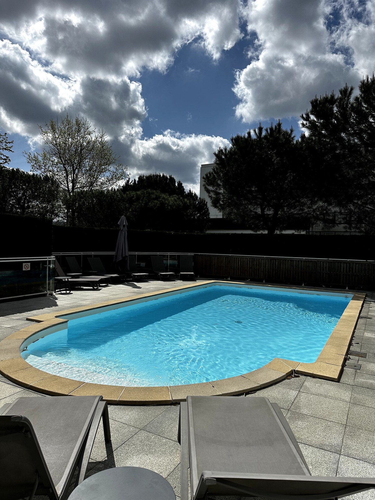 Stan u sklopu hotela Le M & Spa, u blizini aerodroma i 20 minuta od centra Bordoa tramvajem. Dizajniran da primi do 4 osobe, nudi: - Bračni krevet - Kabriolet klik-klak - Kupatilo (kada) - TV - Mikrotalasna rerna, frižider, aparat za kafu, čajnik - Grijanje/klima-uređaj - Otvoreni bazen - - Besplatan parking Možete imati koristi od hotelskih usluga uz doplatu: unutrašnji bazen, spa sa hamamom, restoran, doručak