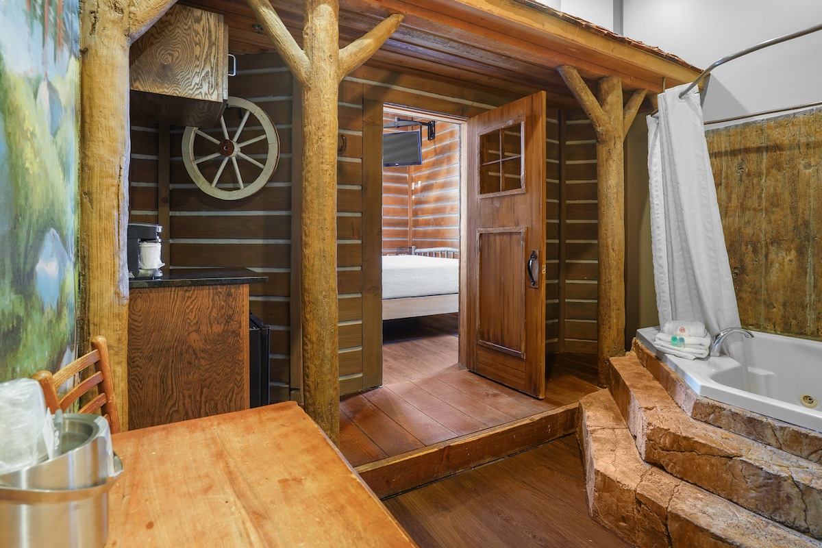 Pobjegnite u planine bez napuštanja grada u našem apartmanu Colorado Frontier u dvorcu Avalon! Sa autentičnim zidovima od trupaca, hidromasažnom kadom uvučenom u „planine”, muralima u divljini od poda do plafona i pogledom na šumu i naše zadivljujuće dvorište, ova soba je čisti rustikalni šarm i moderan luksuz. Savršeno za udoban odmor, romantične noći ili svakoga ko želi atmosferu brvnare sa svim udobnostima butik hotela... bez planinarskih čizama!