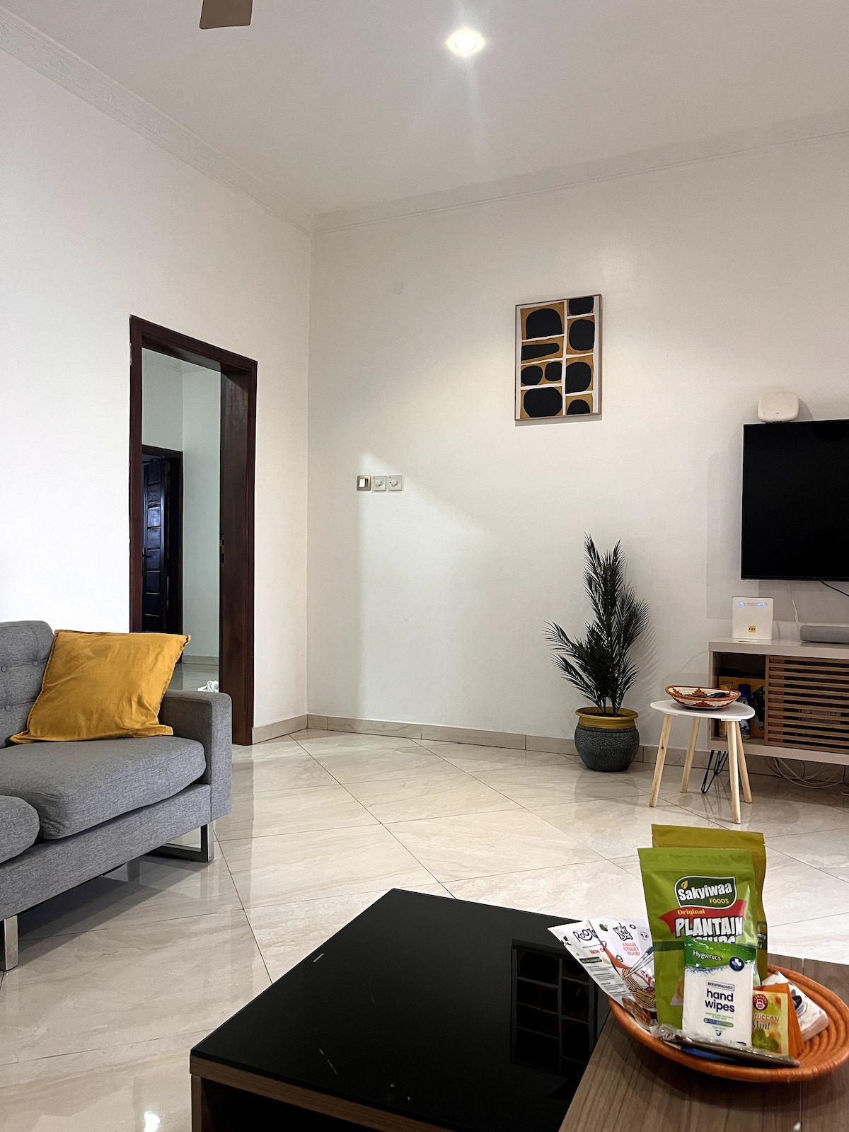 This peaceful and centrally located 1-bedroom apartment, just a 10-minute drive from the airport, is perfect for solo travelers or couples. It offers a comfortable bed, high-speed Wi-Fi, and a washing machine. No power worries there’s a reliable backup generator! Conveniently located for easy access to major attractions and amenities.