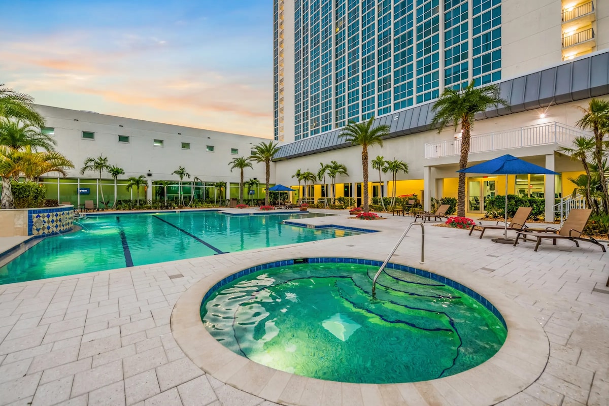 Elegantan kondominijum na 19. spratu sa zadivljujućim pogledom na rijeku Caloosahatchee. Za 4 osobe s jednom spavaćom sobom, 1,5 kupatilom, sklopivim bračnim krevetom i udobnom sofom. Uživajte u bazenu, toplom spa centru, teretani, bioskopu, stonom tenisu, bilijaru i opremi za plažu. Kafić u predvorju sa opcionalnom uslugom u sobi. Bezbjedno, moderno i samo 3 minuta hoda do zabave i objedovanja u centru grada!