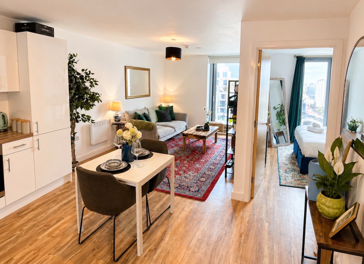 Elegantan dvokrevetni stan sa zadivljujućim pogledom na vodu i besplatnim sigurnim parkingom. Samo kratka šetnja do stadiona Old Traford, O2 Victoria Warehouse i Emirates Old Traford. Uživajte u svijetlom dnevnom boravku otvorenog tipa, balkonu, pametnom TV-u, brzom Wi-Fi-u i dva udobna bračna kreveta. U blizini su MediaCityUK, Deansgate i Trafford Centre sa odličnim transportnim vezama. Idealno za odmor, poslovna putovanja ili odgovarajuće dane - udobnost i praktičnost na jednom mjestu!