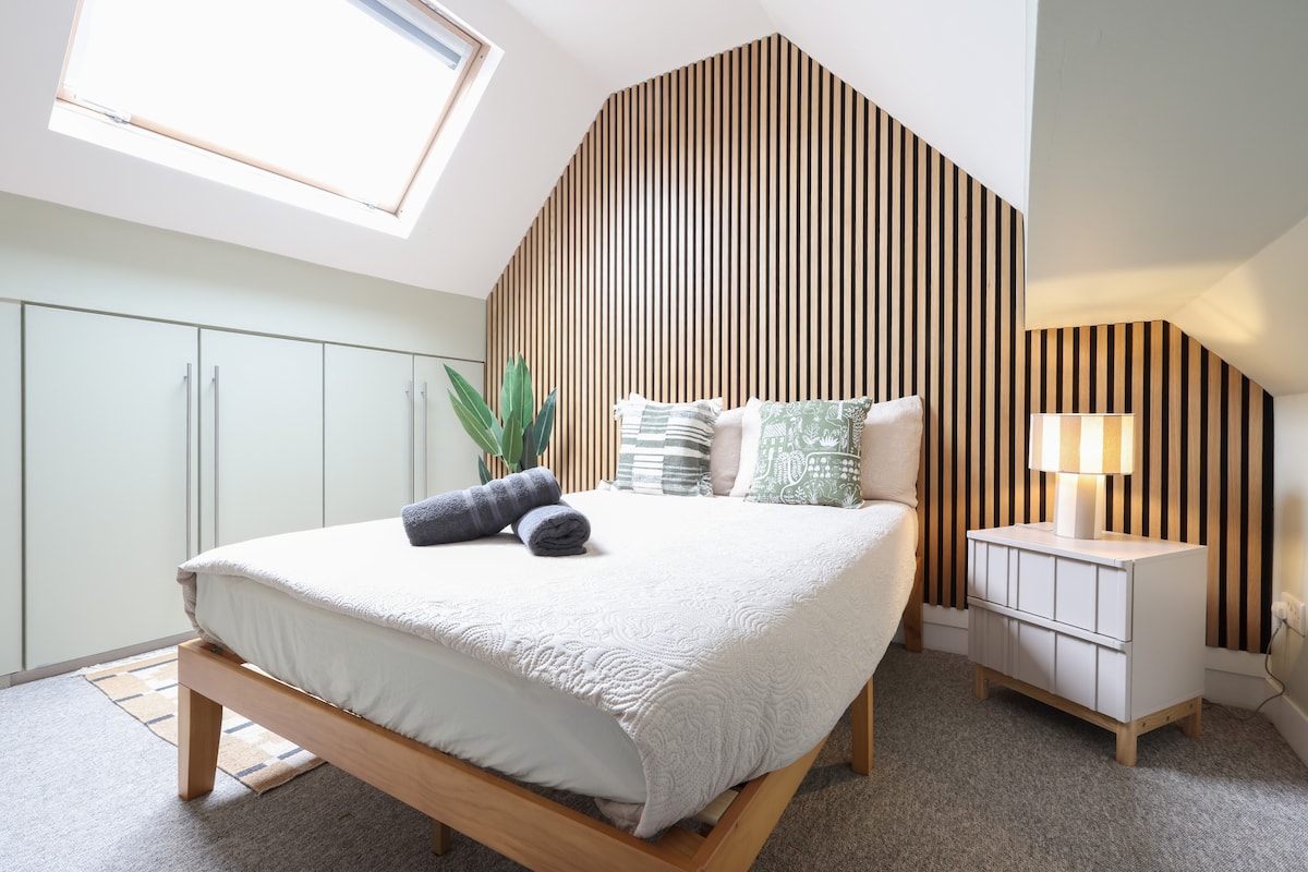Elegantno potkrovlje u centru grada sa izloženim gredama, luksuznom tehnologijom i jedinstvenim detaljima. Uživajte u 55-inčnom Sky Glass TV-u sa punim Sky, Netflix i još mnogo toga, radnoj stanici iMac od 27inča iMac i prodavnici slatkiša za sve uzraste. Može da spava do 5 osoba sa udobnim krevetima, kompletnom kuhinjom, novim kupatilom i brzim Wi-Fi mrežom. Prošetajte do prodavnica, restorana i atrakcija. Parking je udaljen 30 sekundi. Drugi sprat (samo stepenice). Samostalna prijava. Živopisni spavači - svijetli spavači primjećuju urbane zvukove. Provjera tokom boravka važi za boravke duže od 3 noćenja.