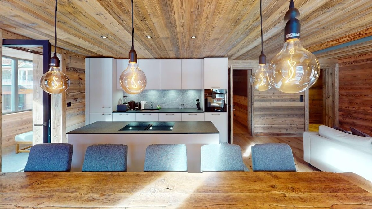 This luxurious chalet of 280m2 and 1740m2 of land is located in the popular village of Les Praz, only 2km from the center of Chamonix. The quietness of its environment, with it's southern exposure as well as the view of the Mont Blanc and on the Drus. The recent renovation guarantees a comfortable stay that meets the expectations of the most demanding travelers, notably via its cinema and sports room, as well as the outdoor sauna.