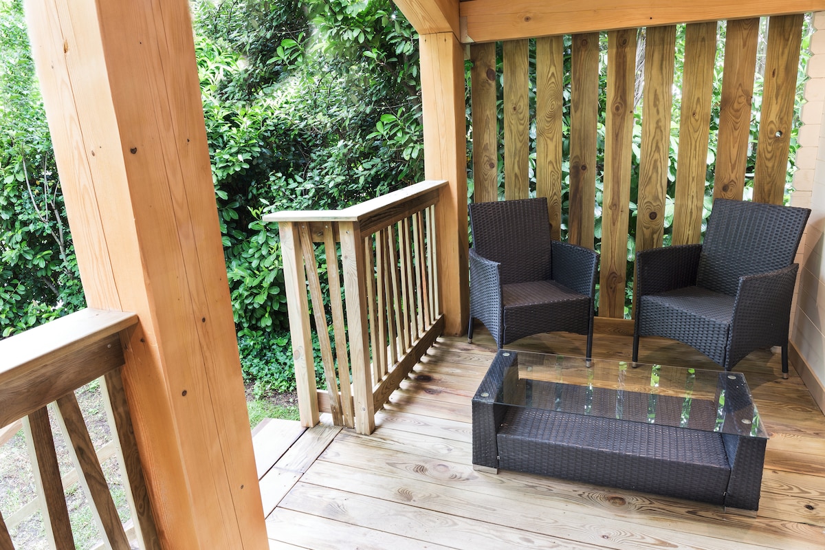 Charming garden chalet (20 m²) for 2–3 guests. Air-conditioned, elevated ground floor with private 30 m² terrace, plancha grill, and a 40 m² private garden. Queen bed (160x200), TV, free Wi-Fi, and courtesy tray. Lounge with 2 armchairs and a convertible bench. Private bathroom with shower, double sink, and separate WC. Fully equipped kitchenette.