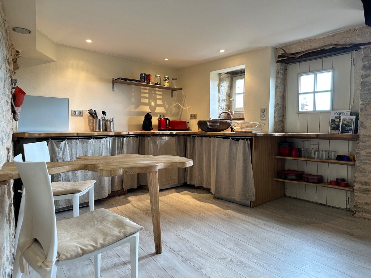 Dođite i otkrijte ovaj pažljivo uređen smeštaj i uživajte u trenutku opuštanja u svom privatnom balneu. Kuća za goste se nalazi 10 minuta od Lavala, u blizini glavnih puteva (autoput 5 min), na obalama Majen i njegove staze za vuču. Uključujući dnevni boravak/dnevni boravak/kuhinju (opremljen i namješten), prostor za spavanje otvoren za privatni đakuzi, tuš-kabinu i toalete. Uživajte u prelepoj bašti i direktnom pristupu stazi za vuču.