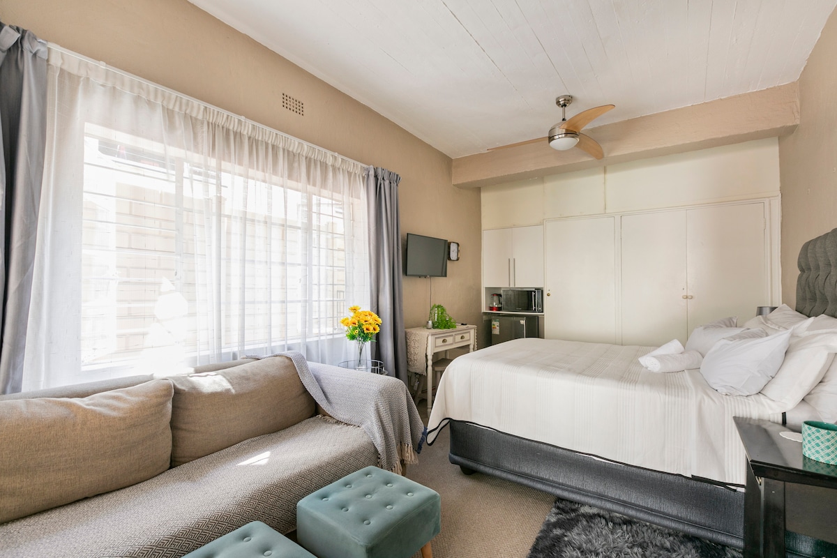 Moderna privatna seoska kuća tipa studio u popularnom naselju Tornhil, na samo 13 km od aerodroma OR Tambo i na bezbednoj pešačkoj udaljenosti od šoping centra Flamingo (500 m) Sa vidljivim gredama, bračnim krevetom (širine 180–220 cm) sa čistom posteljinom, udobnim prostorom za sedenje, dobro opremljenom čajnom kuhinjom, velikim tušem, brzim Wi-Fi mrežom i solarnom energijom. Uživajte u klima-uređaju, namenskom prostoru za rad/trpezariji, privatnom ulazu i prostoru za sedenje u bašti. Bilo da dolazite zbog posla ili vikend-putovanja, naš studio apartman nudi sve što vam je potrebno za opušten boravak.