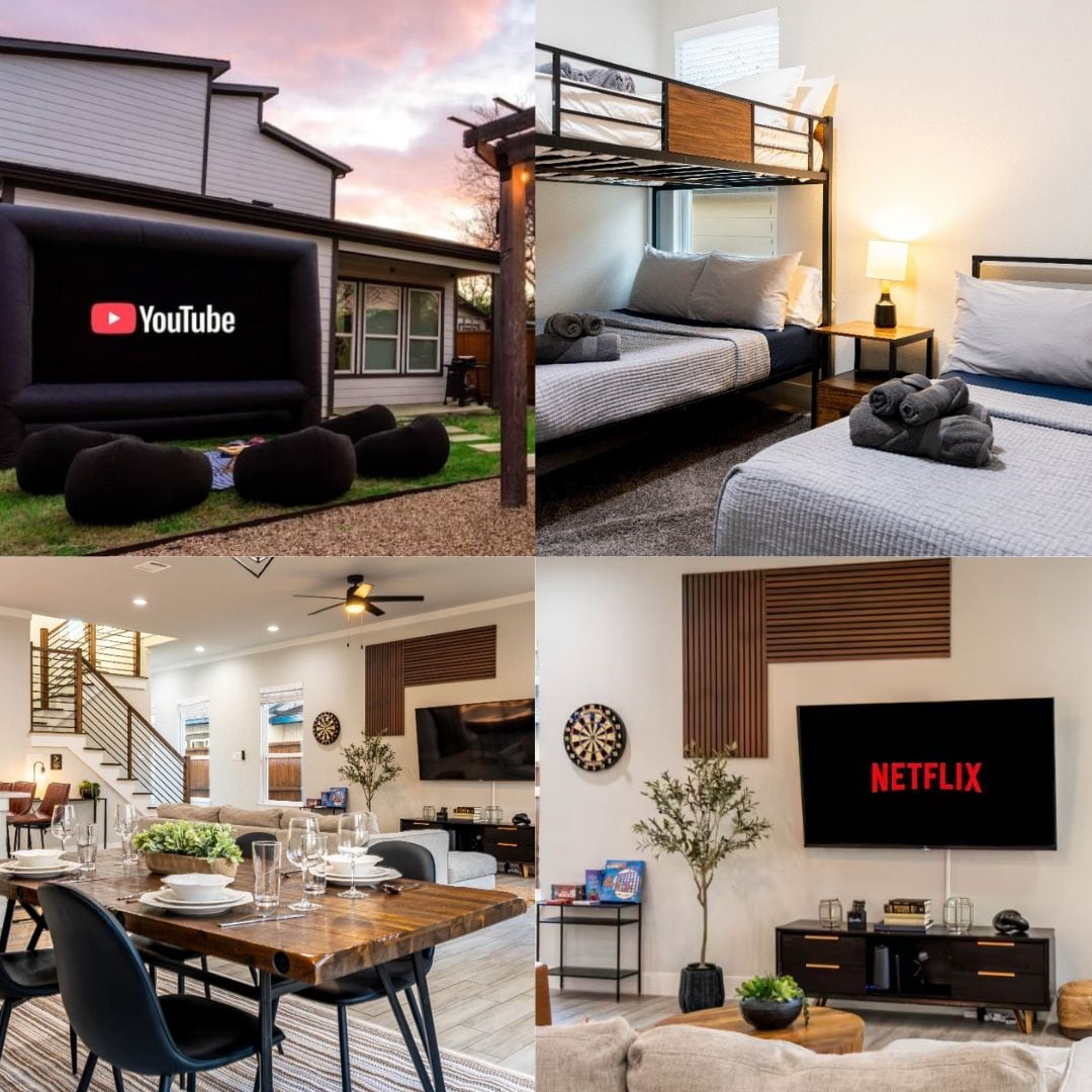 Gilded Getaway – Hosted by All Season Escapes Welcome to the Dallas Modern Retreat, where sleek design meets cozy comfort. ✨ Highlights: 🏡 Stylish living spaces & peaceful bedrooms 🎮 Game room with life-size yard games 🔥 Fire pit with Adirondack seating 💦 Seasonal stock tank pool & hot tub 👢 Vibrant Texas-style mural wall 📽 Outdoor movie setup under the stars 🍽 Fully equipped kitchen for entertaining 🌆 Just minutes from downtown Dallas Your ultimate Dallas escape—book your stay today!