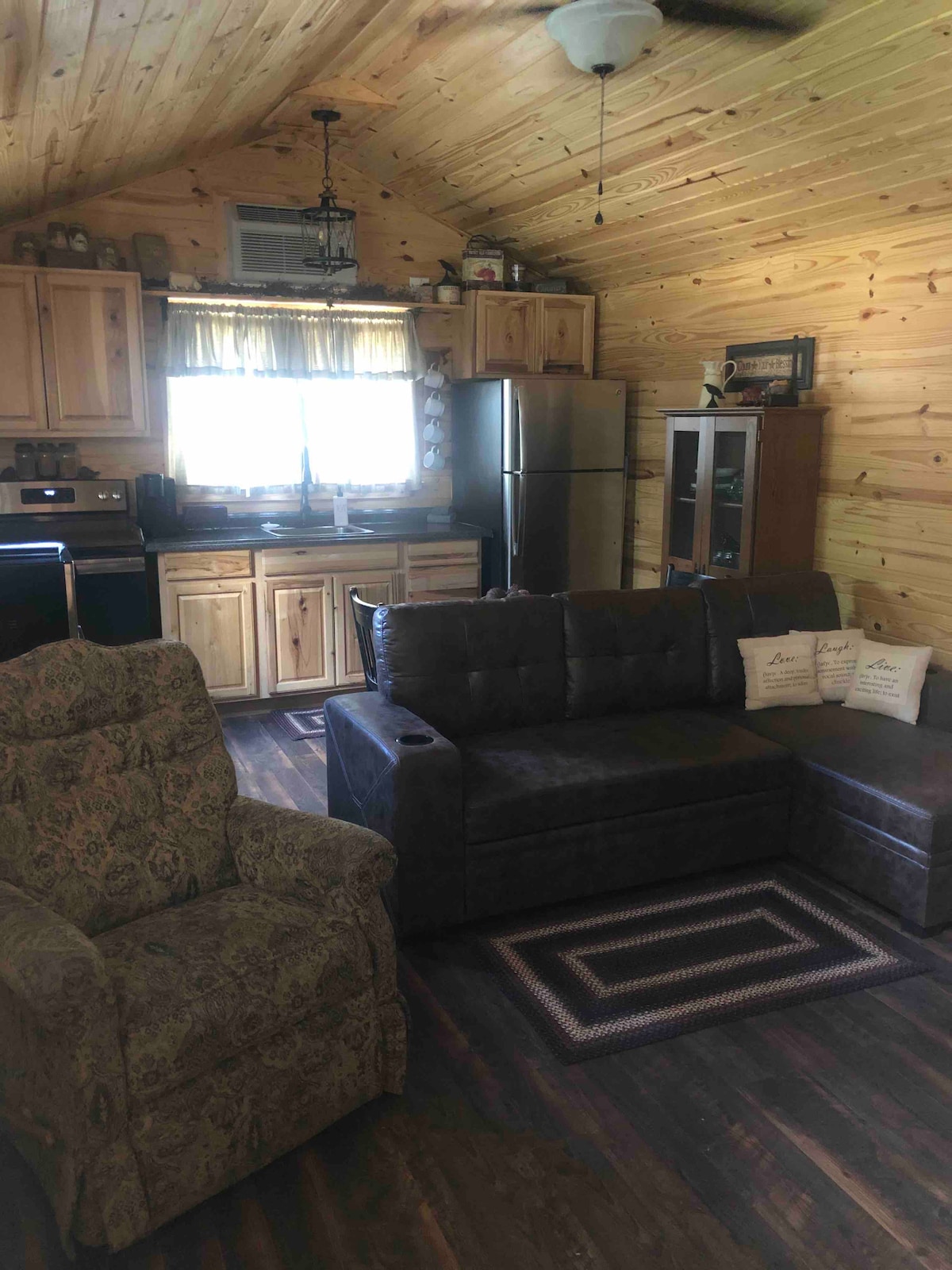 Country style cabin. Interior ceilings, walls and doors solid pine. Vaulted ceiling. Very cozy. On private property surrounded by woods. About 7 minutes from Beech Lake and about 15 minutes from Natchez Trace State Park. Our house is on same property but a good distance apart with privacy fence so cabin is private. Very quiet and peaceful. About 30 minute drive to Jackson, TN