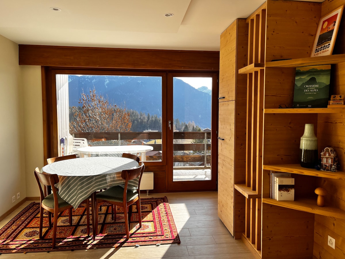 Planinska kuća s pogledom koji oduzima dah u švajcarskim Alpama. Smeštaj ima 2 spavaće sobe, 1 kupatilo. Može da spava do 6 osoba 1 spavaća soba sa bračnim krevetom, druga spavaća soba sa krevetom na sprat, a možete da spavate dvije osobe u dnevnoj sobi. Stan od 49 m2 sa balkonom od 14 m2 zaista je odličan odmor. Besplatan Wi-Fi, TV, igralište i parking koji se nalaze 400 metara od bungalova. Sve čaršafe i peškiri su uključeni u cenu. Zimi dolazimo i pokupimo vaš prtljag sa našim motornim sankama sa parkinga.