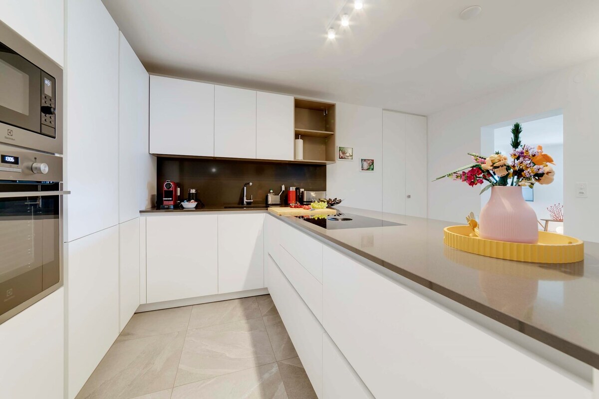 In posizione panoramica, appartamento moderno al primo piano di un nuovo residence con SPA. Questo appartamento dispone di una bellissima terrazza. Il soggiorno è un ampio open space con una cucina completamente attrezzata, una rilassante zona conversazione e un tavolo da pranzo. GARAGE: adatto a vetture di medie/piccole dimensioni. Ulteriori parcheggi gratuiti disponibili nelle vicinanze (indicati nelle istruzioni che verranno inviate)