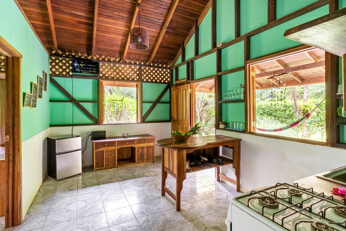 Naša šarmantna garsonjera sa potkrovljem za spavanje nalazi se na 15 minuta hoda i 5 minuta vožnje automobilom od prelepog nacionalnog parka Kahuita i sela Kahuita. Kućica ima opremljenu kuhinju, privatno kupatilo i tuš sa toplom vodom. Na nekoliko koraka od prednje verande kabine nalazi se natkriveno rančo sa trpezarijom i ležaljkama gde možete da se opustite i gledate razigrane posete majmuna urlikaša i Congo majmuna, tukana i povremeno iguana.