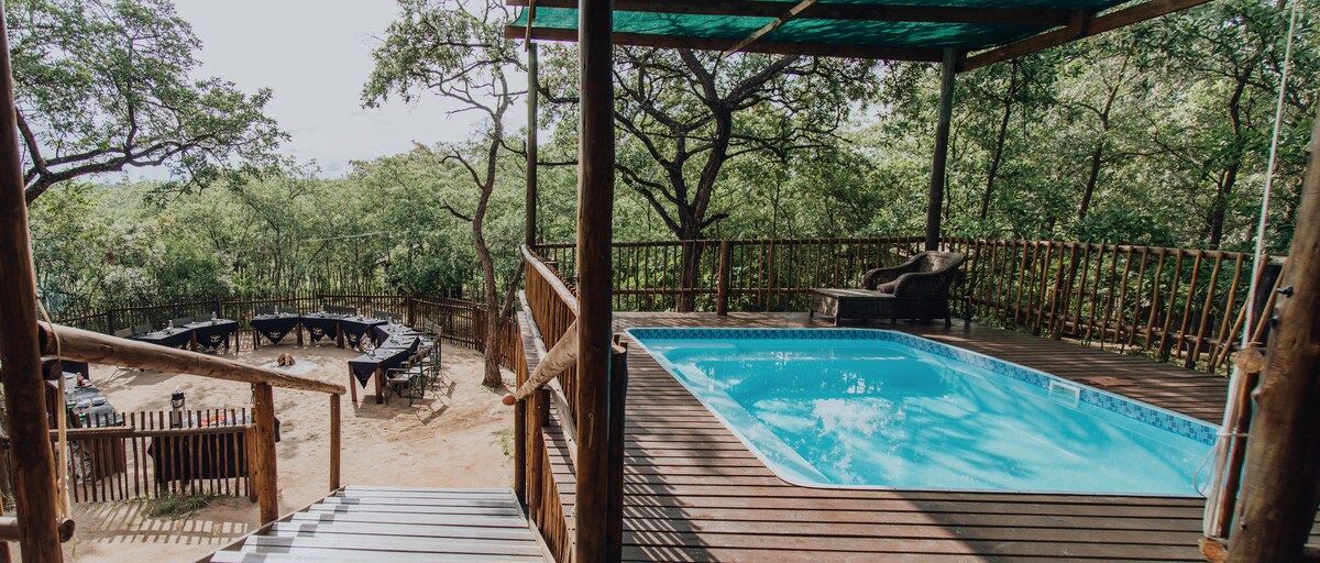 Luxury 2-Sleeper Tent with Pool: Our Aquila tent is uniquely located on a natural elevation in the escarpment, providing magnificent views of the surrounding cliffs, the crystal-clear pond in the mountain stream and the forested valley below. The plunge pool adjoining the deck overflows with pristine, natural earth water that streams out of a fountain on the high ground and is aerated by the waterfall while flowing down the ravine.