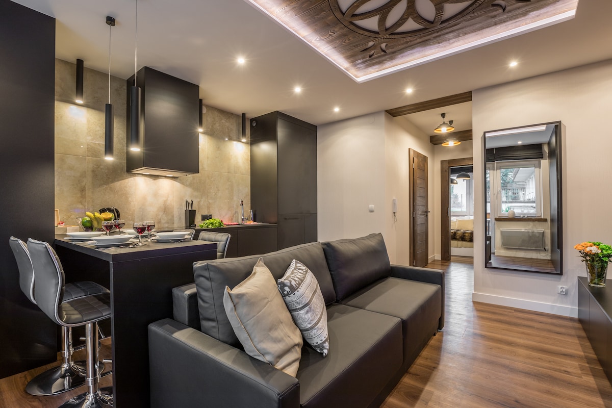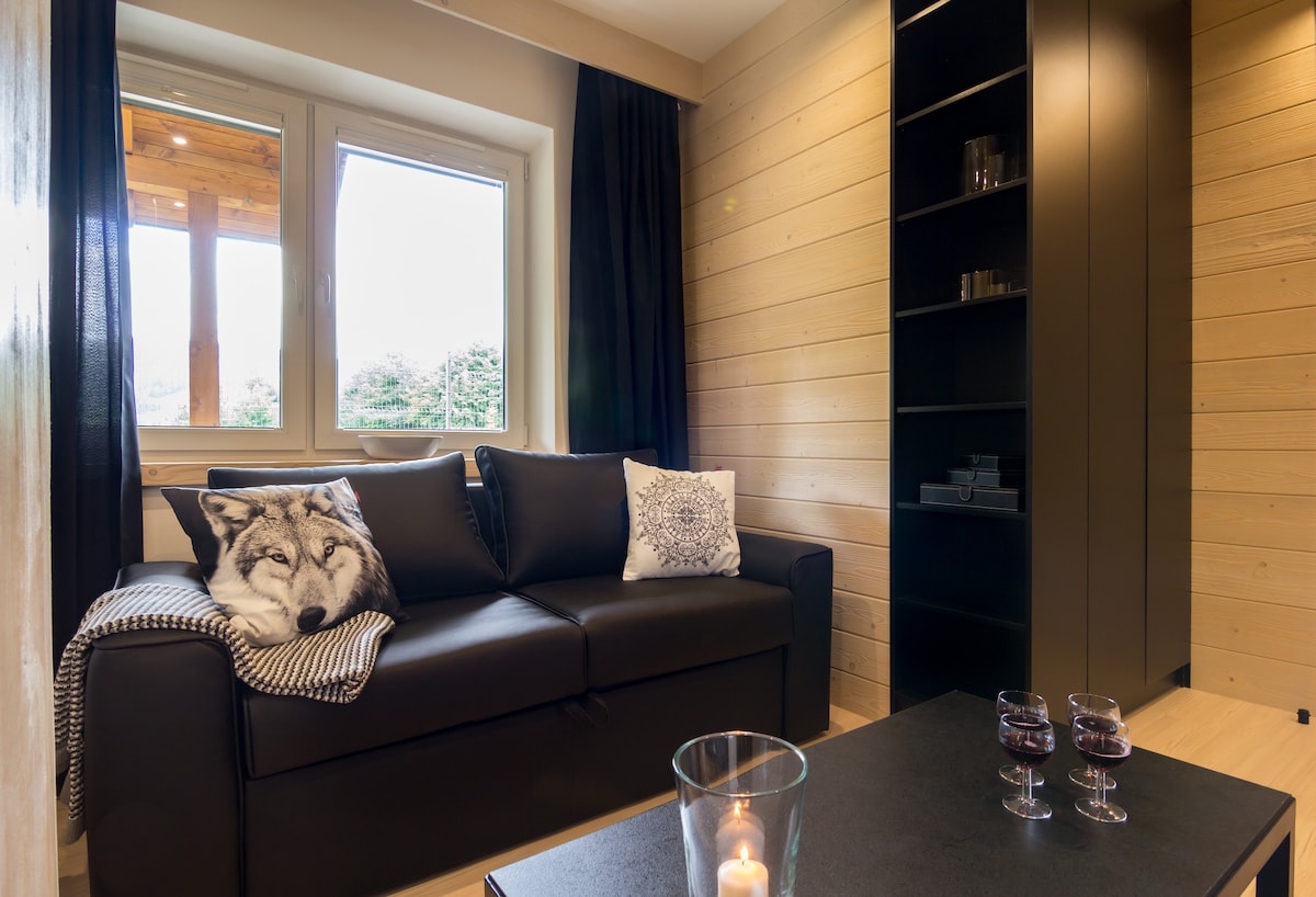 APARTAMENT KAWOWY jest przytulnie i stylowo urządzonym miejscem, w którym niejeden gość poczuje się, jak w górskiej chacie. Wrażenie takie przywołuje duża ilość drewna, jakim wykończone zostało to pełne uroku i stylu wnętrze. Dodatkowym atutem miejsca jest jasny balkon, z którego roztacza się widok na góry oraz ciepły salon wyposażony w kominek. Apartament znajduje się w zacisznej części miasta, z dala od zgiełku i hałasu, ale tylko kilka minut autem od centrum.