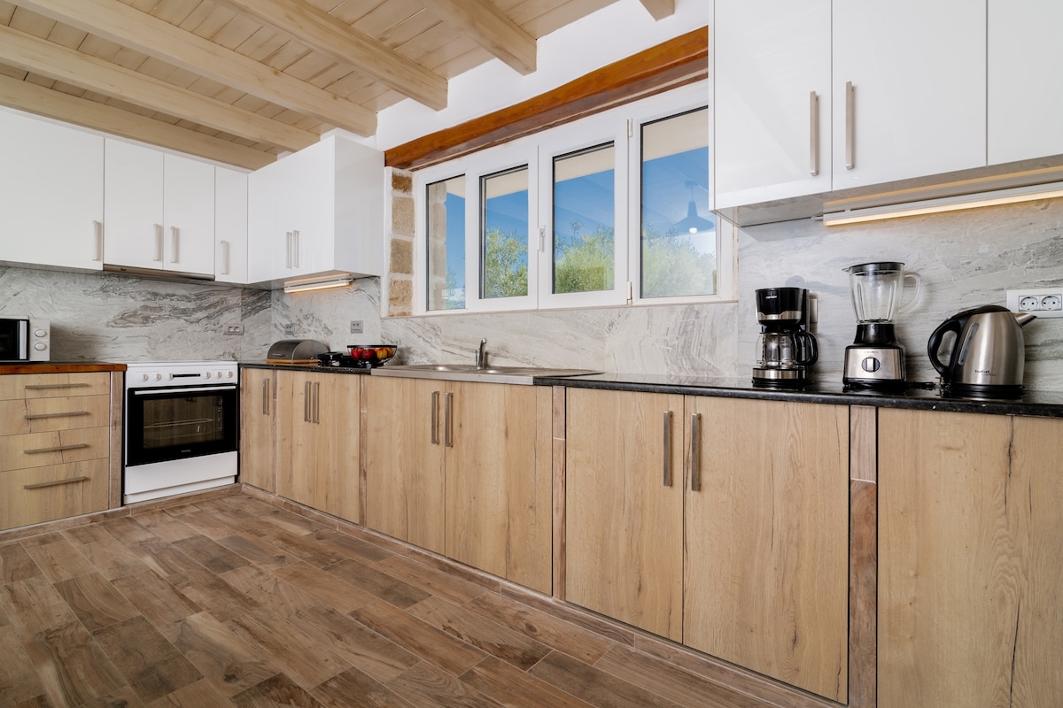 Zauberhaftes Zuhause inmitten der Natur , 15 Gehminuten vom Strand entfernt – mit exklusiver Panoramaterasse . Hier treffen Moderne und Naturverbundenheit zusammen. Wunderschön gelegen in einem Berghang mit Olivenbäumen auf einem großzügigen eigenen Grundstück mit Garten. Die Unterkunft ist ideal wenn Sie Ruhe suchen und einen einzigartigen Panoramablick aufs Meer wünschen. Die Unterkunft bietet eine moderne Ausstattung mit allem modernen Komfort - jetzt auch mit Außendusche
