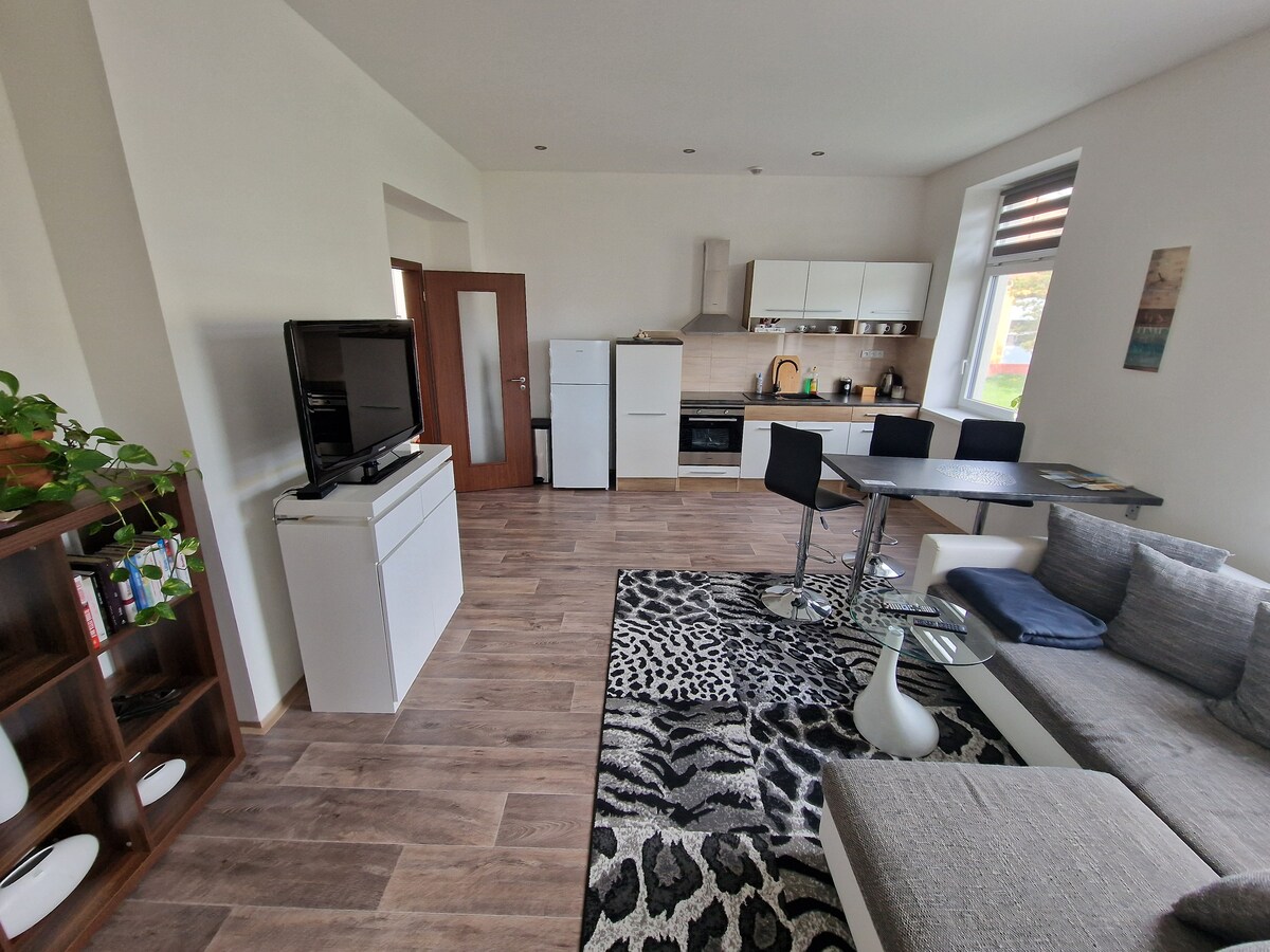 Potpuno novouređeni stan nalazi se u istorijskom spomeniku zaštićenoj gotičkom kućom iz 14. vijeka u samom istorijskom centru Litoměřice. Individualnost stana je podvučena originalnim trezorima i dizajnerskim enterijerom. U blizini se nalaze restorani, kafići i supermarket (30m). Automobil se može parkirati na plaćenom parkingu odmah pored stana, preporučujemo duži boravak na autobuskoj i željezničkoj stanici (500 m) za 10 CZK dnevno.