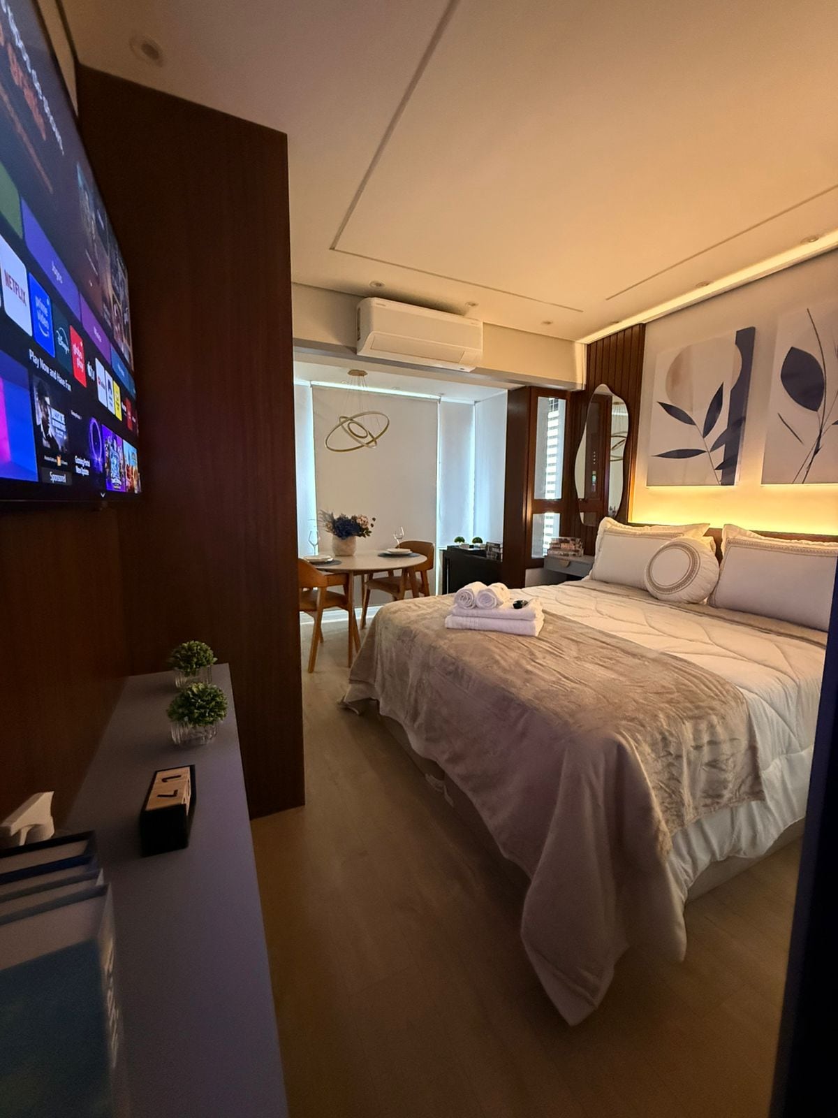 Estúdio mobiliado, excelente localização à 5 min a pé metrô Consolação na Av. Paulista. Com 1 dormitório, cama de casal, ar condicionado/aquecedor, Smart TV Led digital, internet WiFi (grátis), cozinha compacta. Sala de ginástica, quadra de squash, sauna e piscina. Recepcionistas bilingues, garagem com manobristas, segurança 24h. O hotel possui restaurante próprio, com café da manhã (não incluso), almoço e jantar. Lavanderia terceirizada, mensageiros, serviço de limpeza diário (exceto feriados)
