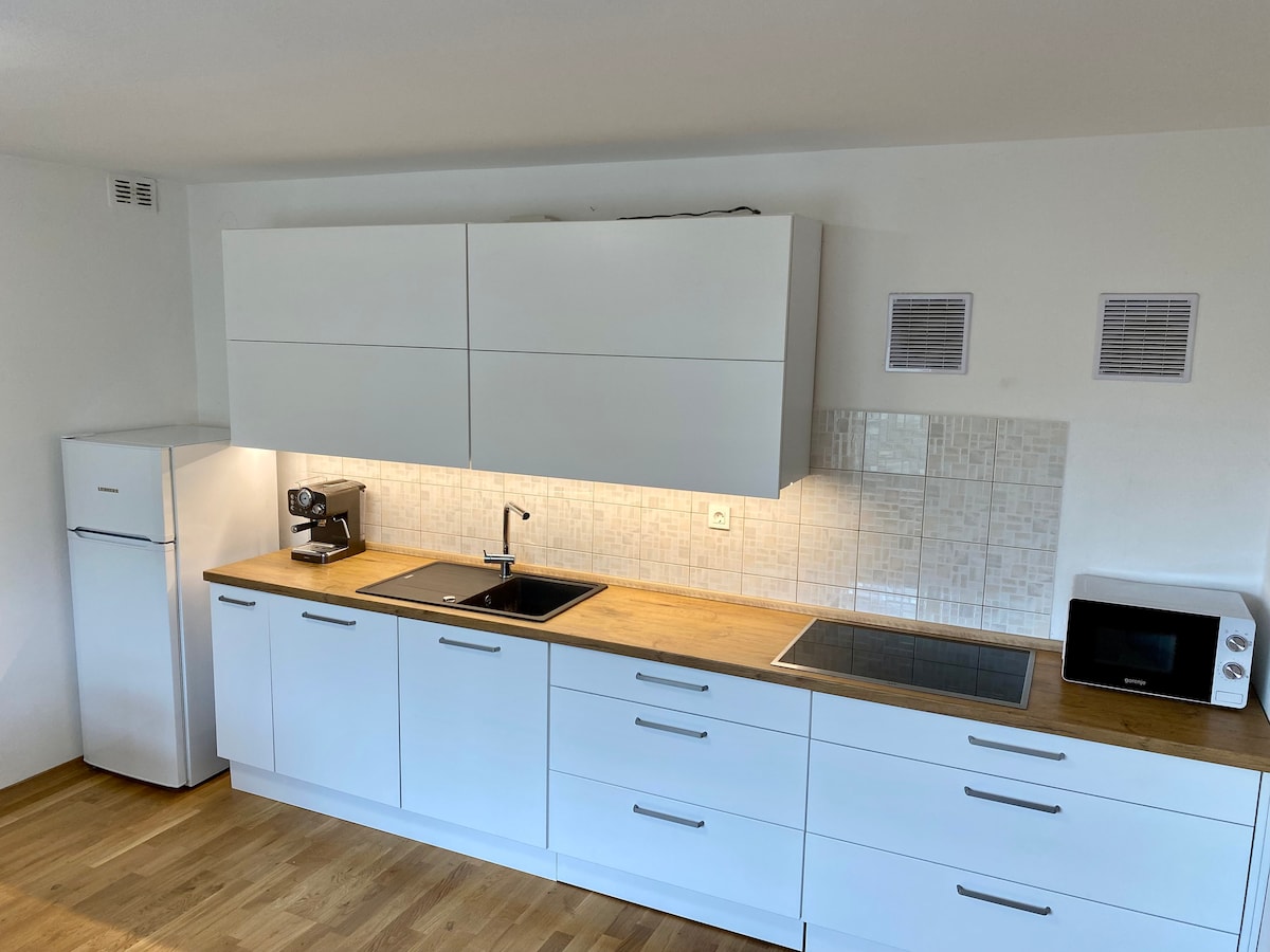 Prostrani apartman u mirnom predgrađu Ljubljane-Vižmarje nudi Vam Wi-Fi, besplatno parking mesto, potpuno opremljenu kuhinju, balkon sa lepom baštom i još mnogo toga. Javni prevoz, nekoliko mesta za jelo i prodavnica namirnica su u neposrednoj blizini. Ljibljana City Centre i veliki tržni centri Supernova i Aleja nalaze se u krugu od 5 km. Pristup autoputu je 500m od kuće. VAŽNO: Boravišna taksa od 3,13 €/osoba/dan nije uključena u cenu i naplaćuje se po dolasku.