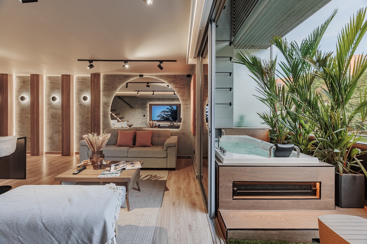 Spectacular duplex apartment in El Poblado, featuring a private jacuzzi as its centerpiece and a luxurious king-size bed for ultimate comfort. Designed with a rustic-modern aesthetic, it offers elegant wood finishes, warm lighting, and a cozy atmosphere. Every detail blends sophistication and relaxation from the fully equipped kitchen to the stylish living area and contemporary décor. A perfect retreat for design lovers seeking comfort, luxury, and an unforgettable stay in Medellín.