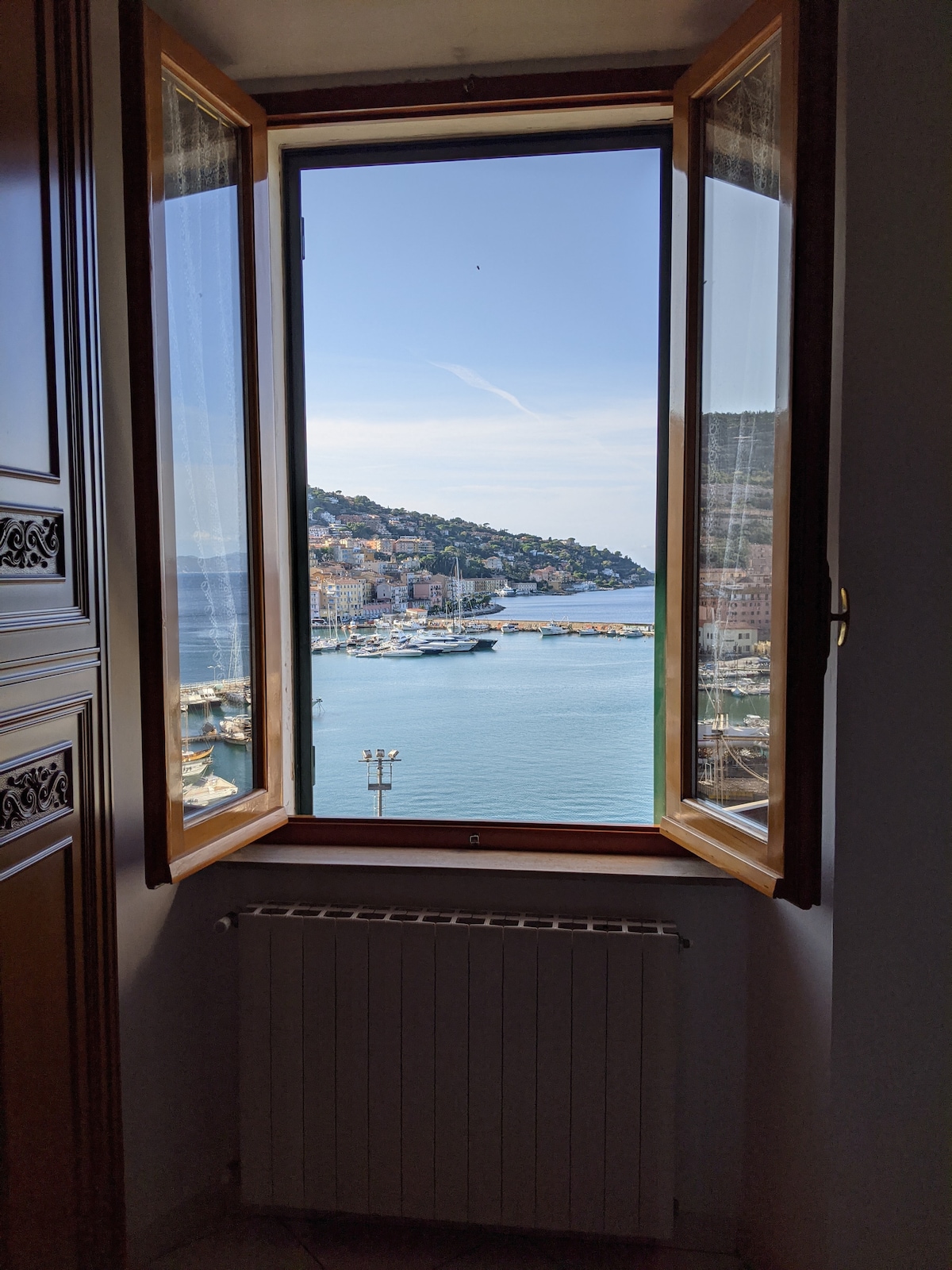 With one of the most extraordinary views in Tuscany, enjoyed even from your bedroom - you will not want to leave! Peacefully located in the most photographed street in the town, yet only 3 minutes walk from restaurants in the beautiful harbour, and 10 minutes to bathing spots, Far Horizons apartment is an recently renovated, colourful and comfortable apartment, with stunning sea views from every window and over the old port, orange gardens and the 15th Century Spanish Fort.