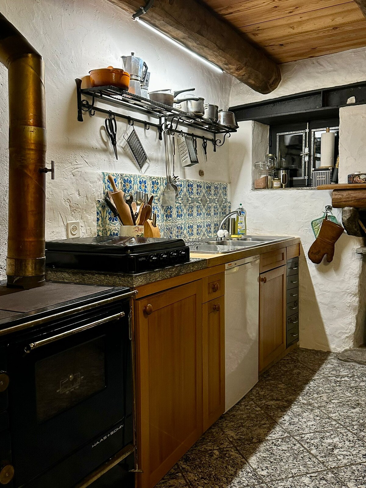 This authentic stone house with balcony is in the village of Vogorno, overlooking Lake Vogorno, and sleeps 4 people. The village is located between the lake and alpine forests and makes an ideal base for visitors who would like a peaceful holiday surrounded by unspoiled nature. The beamed kitchen/dining room is directly off the entrance courtyard. This cosy room has a dining table and antique wooden furniture.