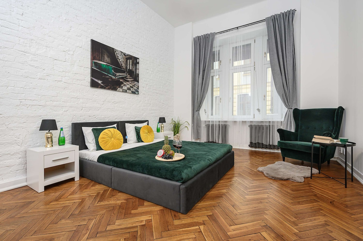 Prostran, svetao i moderan stan sa dve odvojene spavaće sobe, dnevnim boravkom sa udobnim prostorom za sedenje i dobro opremljenom kuhinjom, u istorijskoj stambenoj kući bez lifta. Gosti će se uroniti u atmosferu 19. vijeka Łódź - od starog stepeništa i zidova od cigle do intimnog predvorja, gdje je svaki detalj prožet duhom istorije.