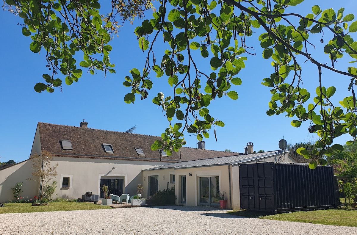 Nalazi se u tihoj ulici u malom selu u blizini Orlove, dođite i uživajte u seoskom vazduhu u ovoj veličanstvenoj kući arhitekte od 400 m2 1 sat i 45 minuta od Pariza, u podnožju šume Orléans. Provedite nezaboravne trenutke sa porodicom ili prijateljima u udobnoj kući, što će oduševiti i mlade i stare sa svojim brojnim stvarima i aktivnostima! Popunjenost u kući je ograničena na 15 ljudi.
