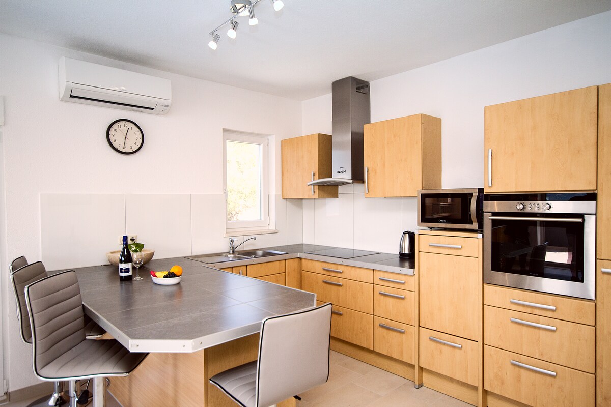 Na brdovitom delu Ivašnjaka nalazi se ovaj apartman od 45 m2 u prizemlju. Novo je opremljen, sa dve spavaće sobe, kuhinjom i dnevnim boravkom i prostranom terasom sa koje se pruža panoramski pogled na more. Pošto se nalazi u prirodnom okruženju, možete uživati u zajedničkom roštilju i na svežem vazduhu. Do plaže vodi blago strm put, ali je moguće ići i automobilom.