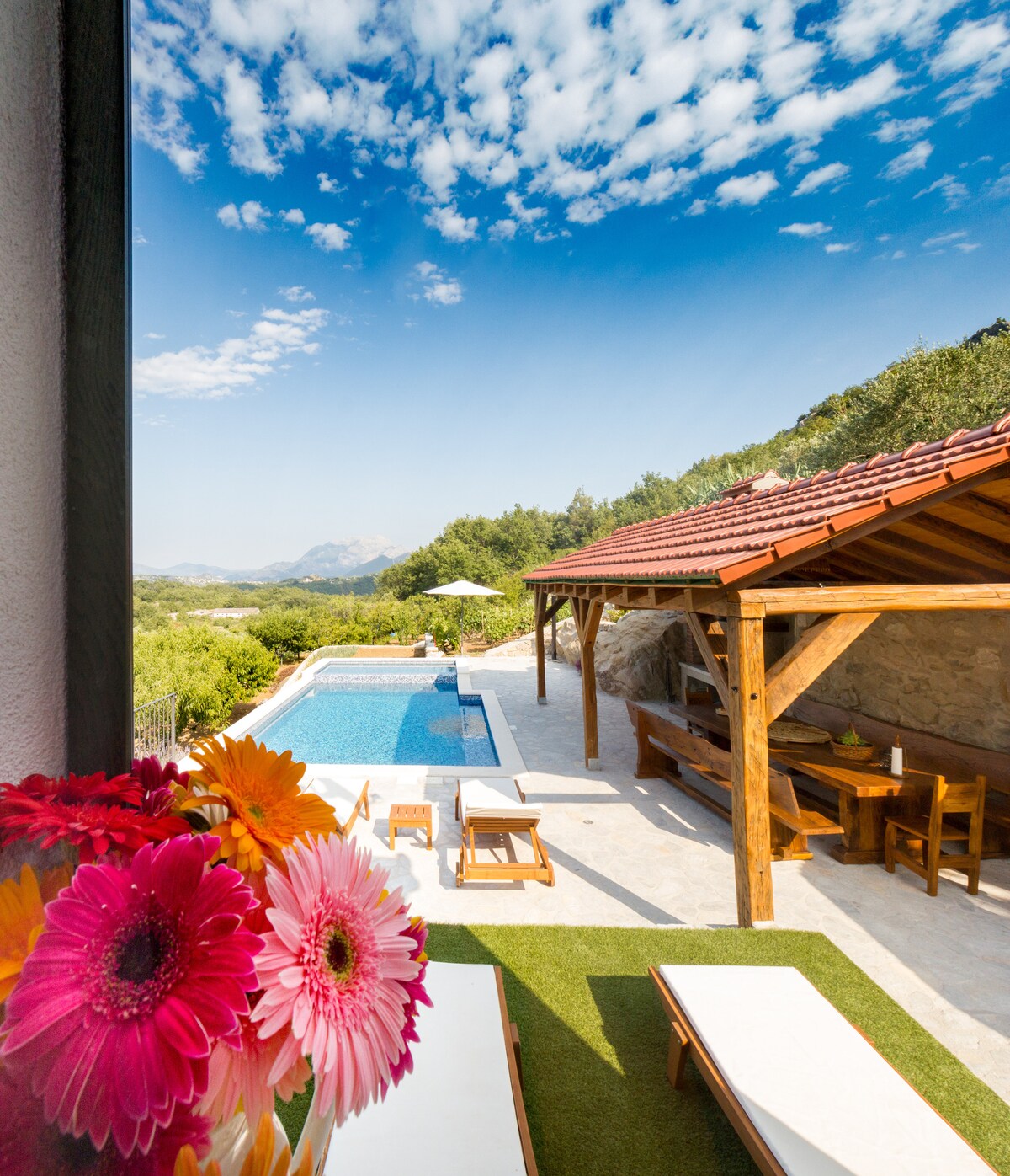 Privatna vila sa grijanim bazenom i baštom u mirnoj izolaciji okružena prelijepim prizorima i mirisima mediteranske flore i planinskog lanca. Kuća garantuje mir, privatnost i potpuni odmor od gradskog života.