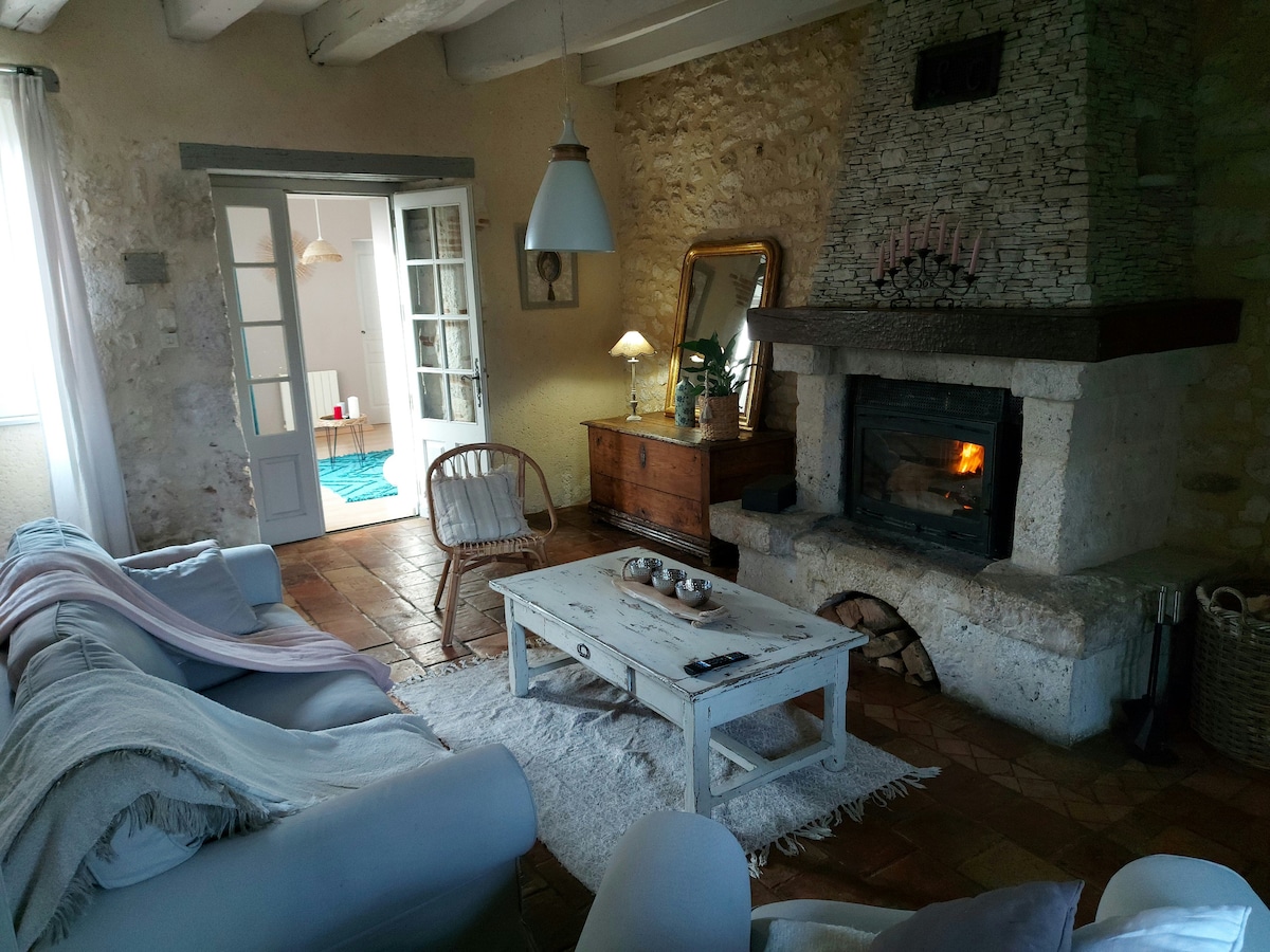Grange en pierres rénovée en 2 gîtes mitoyens séparés par un grand espace jardin d'intérieur. C'est un gîte cosy que je vous propose, idéal pour se reposer dans la campagne à la ferme. Paisible terrasse couverte avec jacuzzi privé à chaque gîte (non autorisés aux jeunes enfants) Idéal pour 4 personnes ou couple Vue agréable, localisation très calme. De nombreuses activités possibles : canoë, balades en Gabares sur la Dordogne, châteaux, villages, grottes, musées, restaurants, brocantes...etc