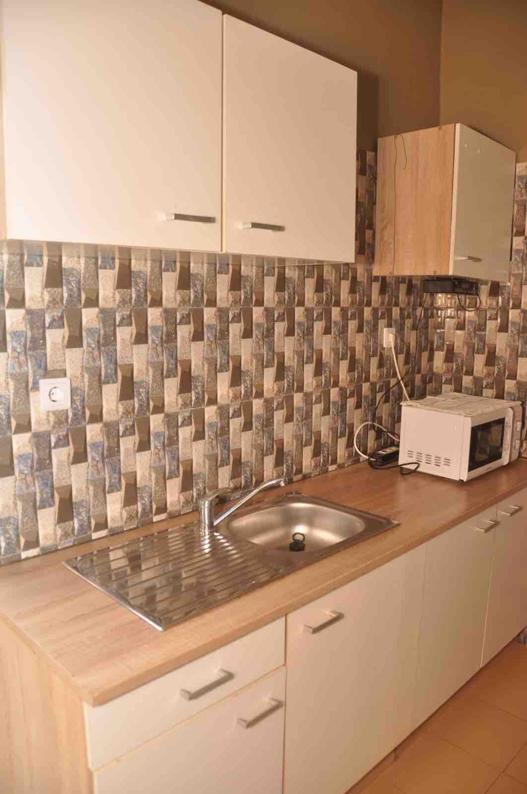 Un appartement est situé au rez de chaussée, moderne et spacieux, avec une cuisine ouverte sur le salon, équipée de tout le nécessaire. Une table, avec 4 chaises confortables et un canapé invitent à la détente. Le salon est équipé d'une TV incurvée . La chambre abrite un lit double, et la salle de bain équipée. L'appart dispose également d'une terrasse pour profiter de l'air libre. Les résidents ont une salle de gym collective et d'une machine à laver commune. L'ensemble est chic et fonctionnel