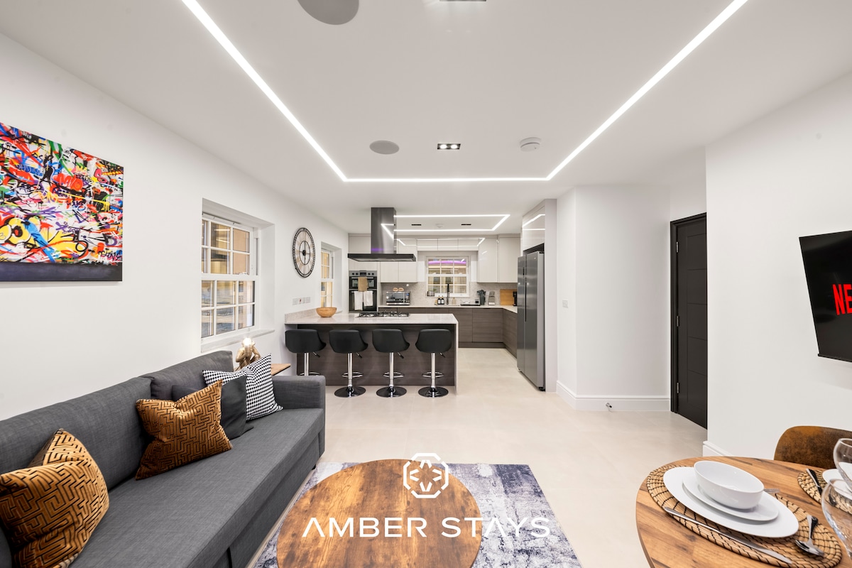 Veliki, umetnički, neobičan smeštaj sa 2 spavaće sobe za 2–6 gostiju (prostor za 12 gostiju na licu mesta – pošaljite nam poruku) Savršeno za vikende, duže boravke i rad na daljinu. Potpuno opremljena kuhinja, mašina za pranje/sušenje veša, punjač za električna vozila, besplatan parking, pogodno za pse – maks. 2. 25+ restorana. Zabavne prodavnice: antikviteti, odeća, umetnost, pokloni, cveće i jorgani. Walk to Henry VIII Hampton Court Palace & Flower Show, Thames riverboats, Bushy Park's Parkruns. Pešačite do londonskih vozova i autobusa do Tvikena i Ričmonda (dom Teda Lasa i LondonAtelierByproducts – pokloni i ženska moda!
