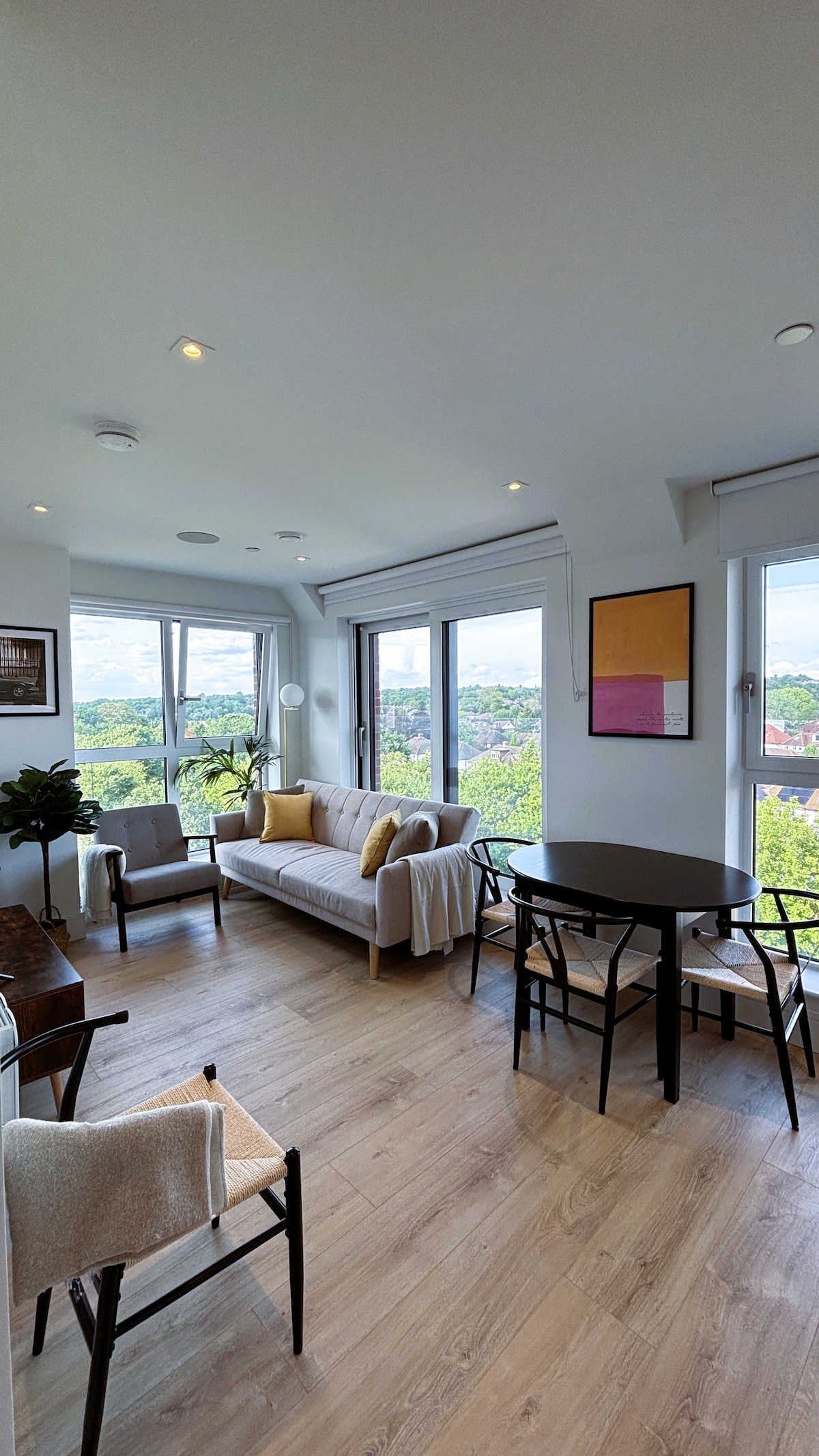 Svijetli i moderni penthaus s dvije spavaće sobe i dva kupatila u srcu Hamersmita, samo nekoliko koraka od mosta i stanice podzemne željeznice. Karakteristike uključuju privatni balkon natopljen suncem, potpuno opremljenu kuhinju, 75-inčni pametni TV sa SONOS Arc Ultra i visokokvalitetnu postavku za rad na daljinu sa dvostrukim monitorima od 27inča i (300 mbs) Starlink internetom. Savršeno za porodice, profesionalce ili osobe koje rade na daljinu i traže udobnost, stil i nenadmašnu lokaciju.