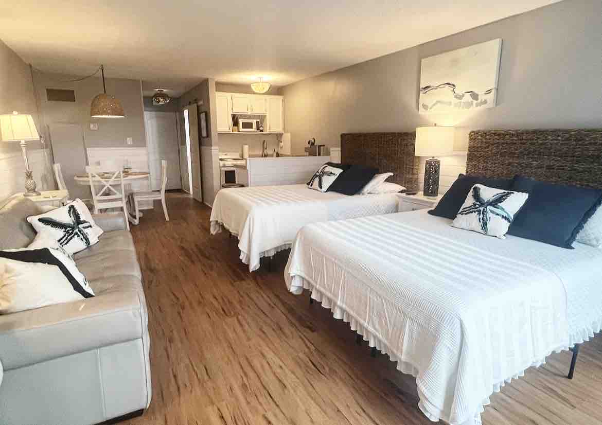 Ovaj studio apartman pored plaže nalazi se na prvom spratu i može da primi 4 osobe! Ova jedinica ima 2 luksuzna bračna kreveta i kauč, 1 kupatilo, potpuno opremljenu kuhinju, trpezariju i 50-inčni smart TV. Sav nameštaj u ovoj jedinici je potpuno nov za vaše uživanje. U ormaru sa prostorom za stajanje možete da odložite prtljag i okačite odeću, a tu su i ležaljke, peškiri za plažu i suncobrani. Ova jedinica je takođe na nekoliko koraka od restorana „Tootsie's” koji će uskoro biti otvoren.
