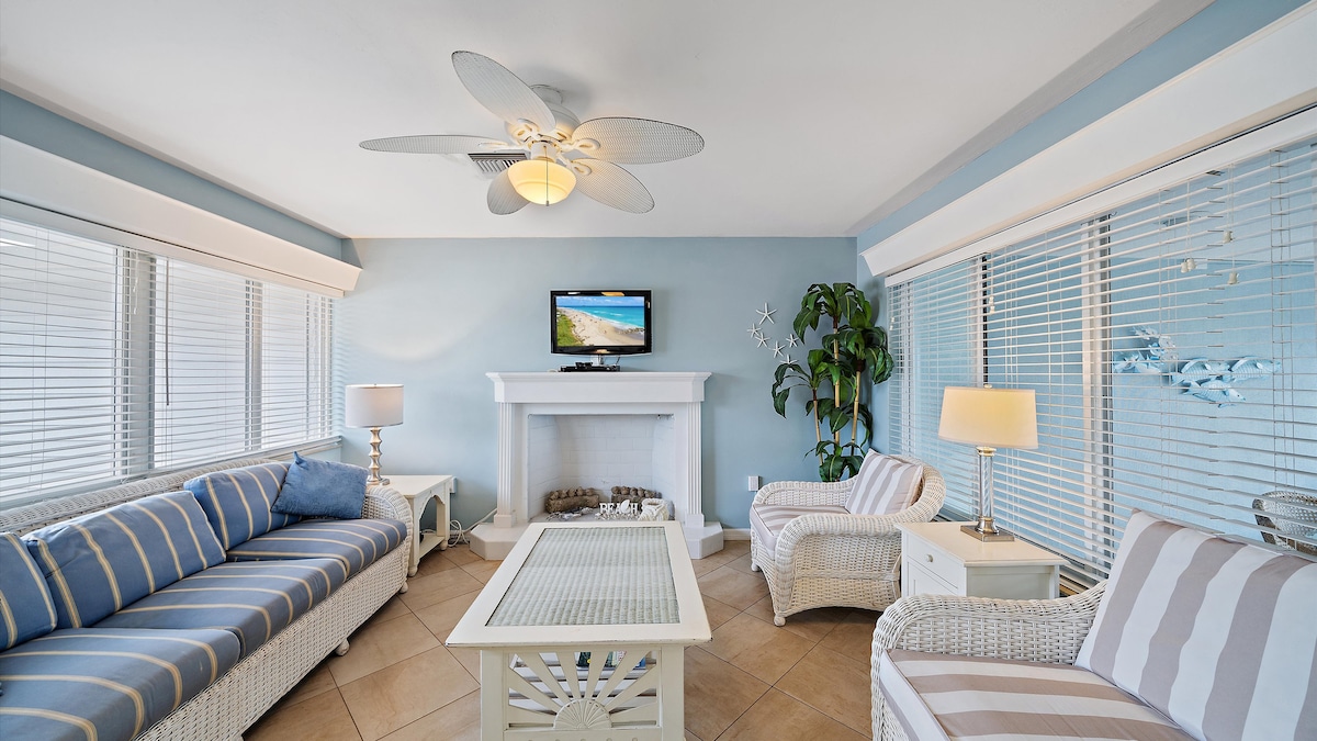 Bliss uz plažu — nema ulica za prelazak, samo nekoliko koraka od pijeska! Uživajte u veličanstvenom pogledu na zaliv i zalazak sunca sa svog privatnog balkona u ovom prostranom, novouređenom kondominijumu. Sa potpuno novim kupatilom i novim podovima, ova jedinica na 4. spratu (sa pristupom liftu) savršeno je utočište za vaš odmor na dugom brodu. Kondominijum može udobno da primi do 6 gostiju. Pijuckajte jutarnju kafu ili posmatrajte delfine i zadivljujuće zalaske sunca s balkona s pogledom na Zaliv od 180°. Lift.