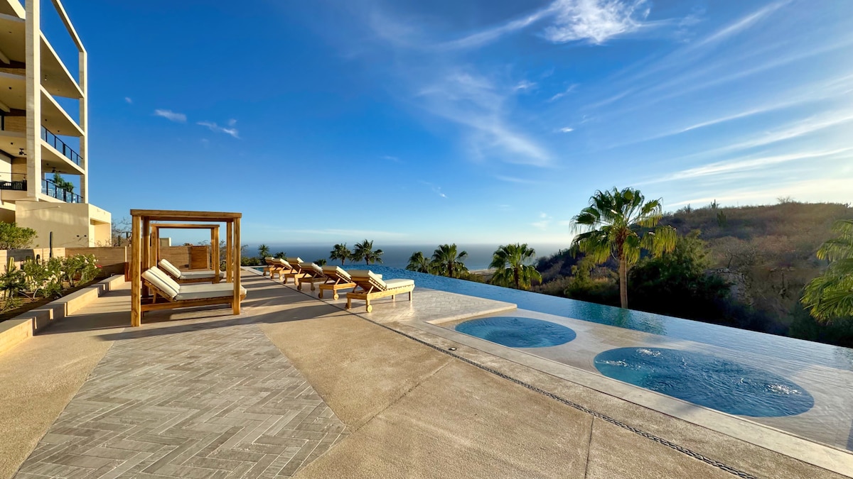 Ognjište na krovu u sumrak. Prelivni bazen popodne. Plaža Medano je udaljena 5 minuta. Ovaj penthaus na najvišem spratu je vaša baza za uživanje u Kabu baš onako kako vi želite: lenja jutra uz kafu i pogled na Tihi okean ili celodnevni izlazi sa već spakovanom opremom za plažu. U 2 spavaće sobe može udobno da spava 5 osoba. Kuhinja je opskrbljena. Obezbeđenje danonoćno. Konsijerž na poziv. Vaš jedini posao? Da se pojavite.