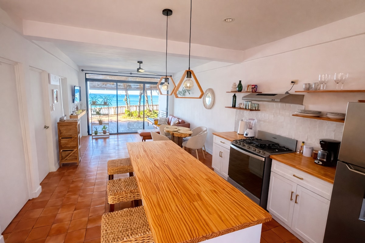 Prednja kuća na plaži, ekološki prihvatljiva sa bazenom dugim 90 stopa, 4 spavaće sobe 3 spavaće sobe sa privatnom visećom ležaljkom na drugom spratu, dnevnim boravkom i pogledom na okean, bračnim krevetima sa klima-uređajem 1 standardna spavaća soba pune veličine, sve sa privatnim kupatilom. potpuno opremljena kuhinja, društvena palapa sa vazdušnom visećom ležaljkom do 6 osoba, 12 osoba za ručavanje, dnevna šetnja, roštilj, terasa ispred okeana. Dnevni boravak na TV-u, kupatilo za druženje, starlink Wi-Fi, 2 sata udaljen od aerodroma. Parkiranje do 8 automobila.