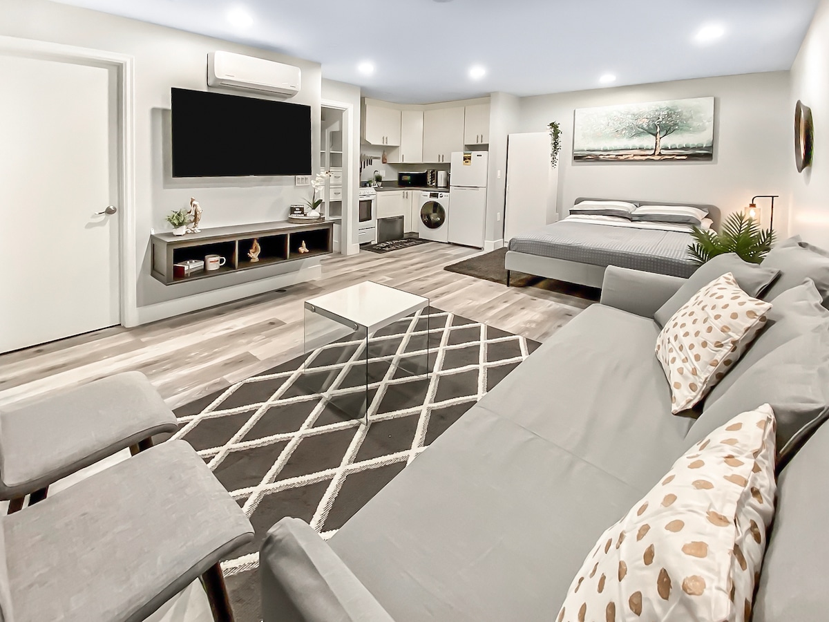 Perfect for solo travelers or those with pets, this centrally located San Jose suite combines luxury and comfort. Sleep like royalty on a queen bed, start your day with a Nespresso, and enjoy a mini-fridge, microwave, and 43" TV at your workspace. Indulge in premium toiletries, AC, and use the hair dryer and steamer for a polished look. Easy self-check-in/out. The trendy wood panel wall adds style, creating your private cocoon. Plus, enjoy a private yard to relax and feel the outdoor breeze.