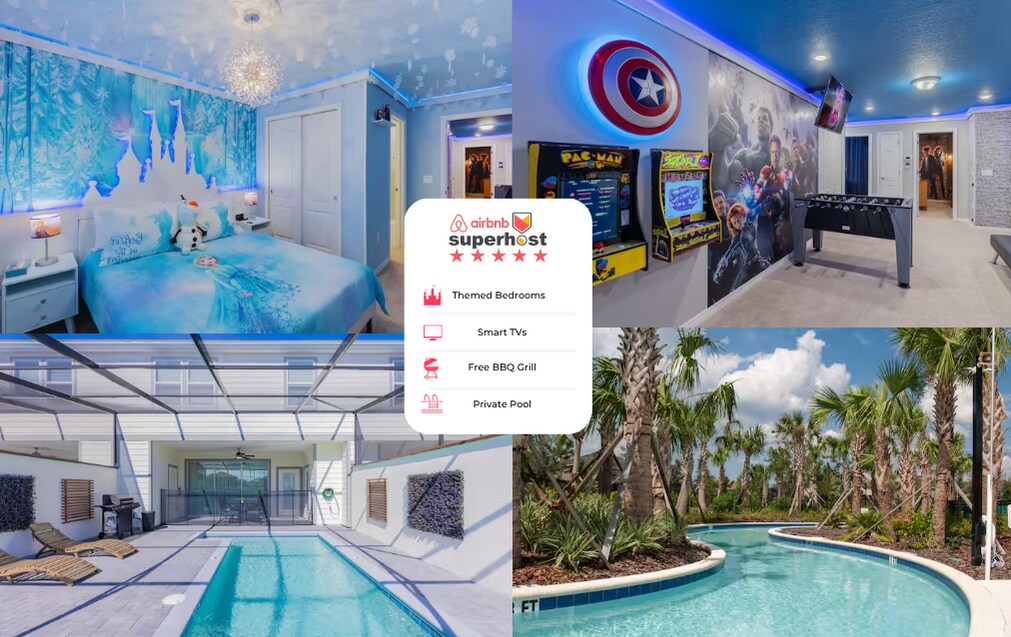 ❤ Illusion room with character outfits ❤ Private pool with water view ❤ 15 min to Disney ❤ 25 min to Universal, SeaWorld, Convention Center, 2 min to Walmart ❤ Game room with board games & kids toys ❤ 100" movie theater screen ❤ Free Netflix ❤ Fully equipped kitchen ❤ Sleeps 12 ppl ❤ 2 king beds, 2 cribs, 1 Queen memory foam sofa bed, 6 twins ❤ Newly renovated home ❤ Fully stocked home ❤ Alice in Wonderland®-themed home ‼️ No parties, No smoking, 4 dogs max $75/pet