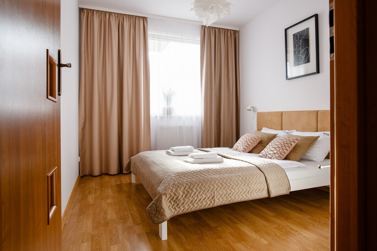 Mieszkanie o powierzchni 52 m² z dużym balkonem, na parterze. Do dyspozycji Gości aneks kuchenny z pełnym wyposażeniem : zmywarka, pralka, lodówka, piekarnik, sztućce, kieliszki, garnki do gotowania. Przestronny salon z dużym rozkładanym narożnikiem, szafą, regałem z szufladami, TV z dostępem do Netflixa, darmowe WiFi. Sypialnia z łóżkiem małżeńskim 140 cm. Łazienka z prysznicem. Darmowy publiczny parking 24h/ dobę