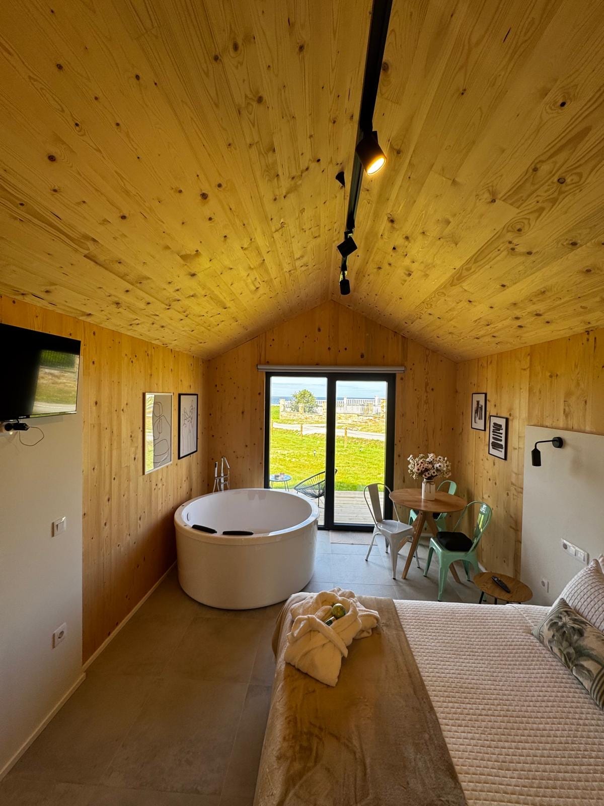 Cabañas En O Barqueiro a 5km de o Vicedo, 15Km de Viveiro y de Ortigueira. En A Mariña y en Ortegal. Unas escaleras te invitan a sumergirte en esta villa con vista panorámica de la ría y las montañas, Espacio diáfano (salón – cocina – habitación) con acceso directo al jacuzzi exterior cubierto con frontal abierto y baño independiente. Ven a disfrutar de gastronomía y festivales como Resurection Fest y Mundo Celta. Lugares de ensueño como Fuciño do Porco, Banco de Loiba, Estaca de Bares.