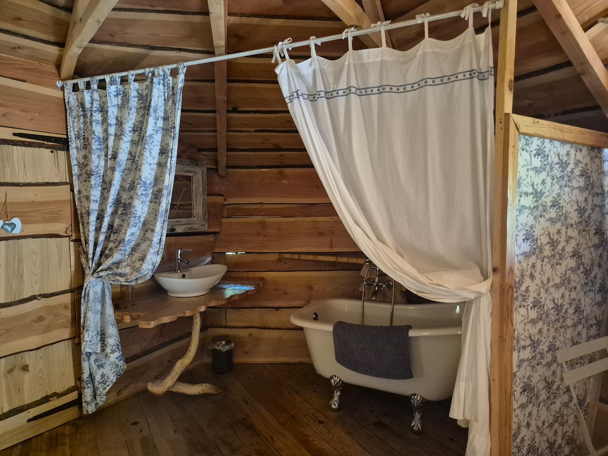 Ovaj jedinstveni i prepoznatljivi objekat nalazi se na mirnoj lokaciji na uzvisini u okviru kompleksa. Naša udobna drvena planinska kuća dočekuje vas među bambusom i borovima. Ovde živimo u ritmu prirode zahvaljujući velikim staklenim otvorima, idealnim za punjenje svetlošću i divljenje zvezdanom nebu. Ukusno uređenje i apsolutna udobnost. Od septembra do aprila, spa je moguć uz dodatnu naknadu: nordijsko kupatilo sa drvenom vatrom! Dobro došli u naš dom! Lorin i Viktor
