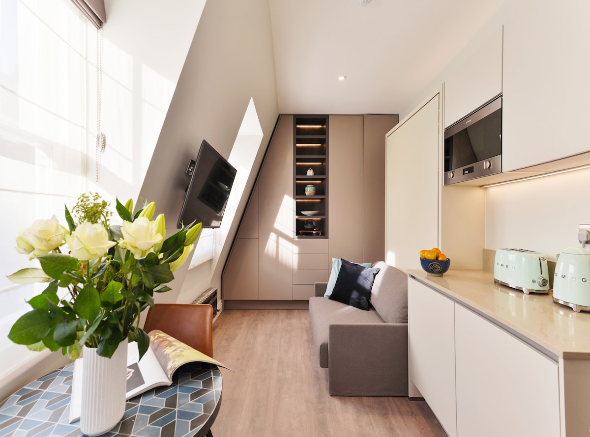 Naši potpuno novi apartmani sa jednim bračnim krevetom, imaju potpuno opremljene kuhinje sa najnovijom kuhinjskom opremom, uključujući fantastičan aparat za kafu Grind, džepne krevete veličine King s 400 čaršava, hipoalergenske jorgane i jastuke i ogromne kišne tuševe sa komplementarnim proizvodima Fills. Izuzetno brz - Wi-Fi sa optičkim vlaknima za svaki stan pored 4K Smart TV-a od 40inča. Svi stanovi imaju klima-uređaj u dnevnim i spavaćim prostorijama i mašinu za pranje/sušenje veša. Ostanite neutralni