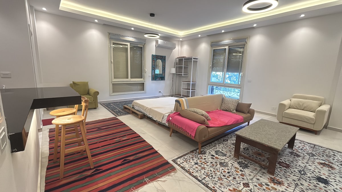 Themed minimalist design rooms with patio and pool access, designed and fully furnished to fulfill one needs. Unique location with clear routes and easy access to, - Local market (5 min walk) - Bus station (5 min walk) - Downtown / Cairo festival City "Mega mall" ( 10 min walk ) - Soudi Market and 7 stars local mall. (10 min walk)
