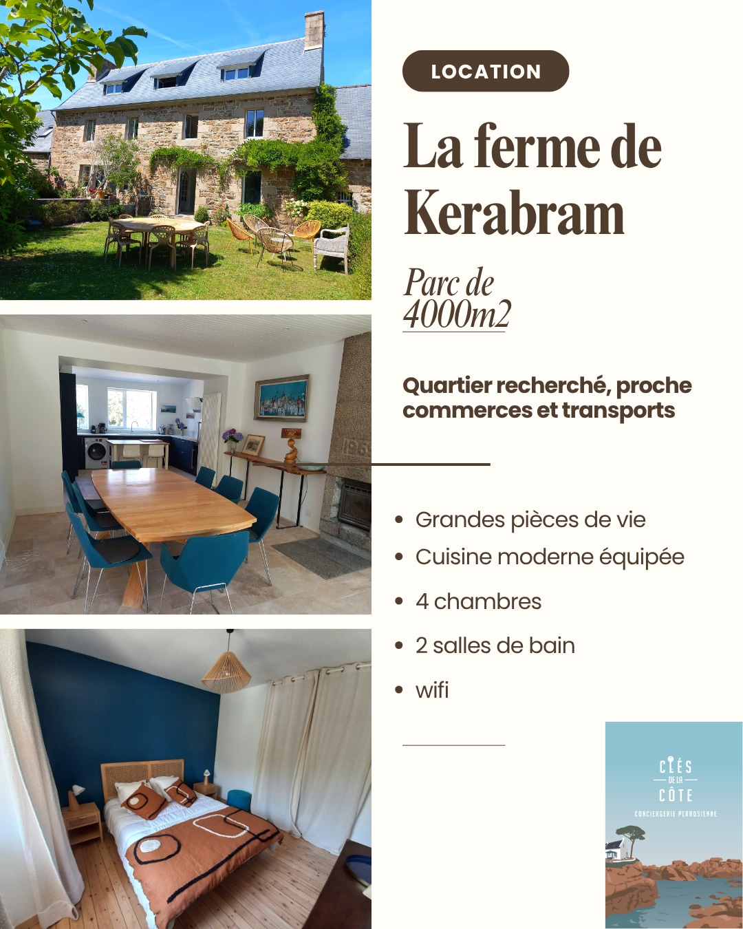 Tipična bretonska kamena kuća iz 1831. godine, deo stare seoske kuće, potpuno renovirana i dobro opremljena. Nalazi se usred sela, a da nije predaleko od sela, u blizini mnogih planinarskih staza (Belfri šuma), kao i mora (Perros-Guirrec). Ovde vlada mir i spokoj dok ste u mogućnosti da brzo pronađete različite aktivnosti jer se dobro nalazi između mora i kopna.