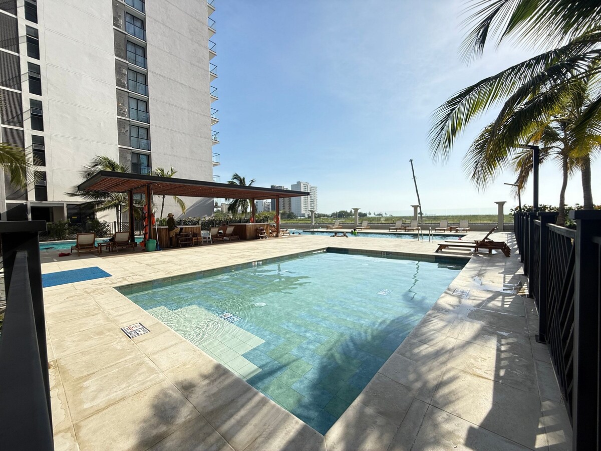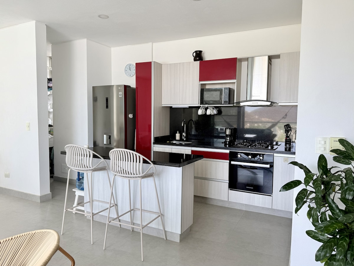 Probudite se uz predivan pogled na okean u Santa Marti. Ovaj udoban apartman ima sobu sa bračnim krevetom, privatno kupatilo, dnevni boravak sa sofom na razvlačenje, potpuno opremljenu kuhinju i mašinu za pranje veša. Uživajte u kafi na balkonu sa pogledom na okean i blizini plaže. Idealan prostor za parove ili četvoročlane porodice koji traže odmor, udobnost i nezaboravan doživljaj na moru.