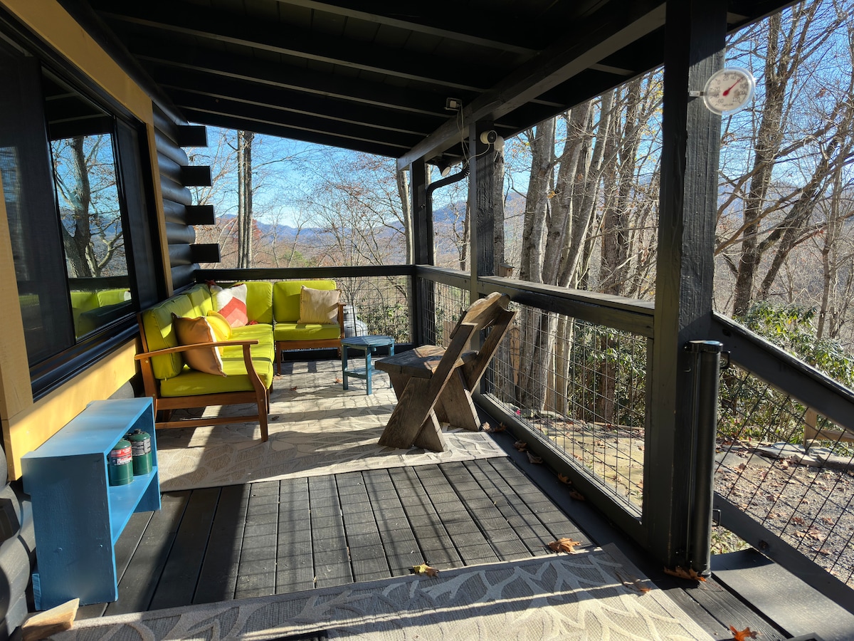 Uživajte u mirnom pogledu dok pijete jutarnju kafu ili večernju čašu vina na prostranom prednjem tremu naše udobne brvnare od 800 kvadratnih stopa. Ovaj dom sa 2 spavaće sobe i 2 kupatila ima natkrivenu prednju verandu i veliku bočnu terasu sa trpezarijom na otvorenom i ognjištem. Brvnara se nalazi na više od 1,5 hektara, tako da ima dovoljno prostora za uživanje u privatnom vremenu u prirodi. Nalazi se na 12 minuta od doline Megi, 20 minuta od centra Vejnsvila i 30 minuta od Ešvila i doline Kataloči.